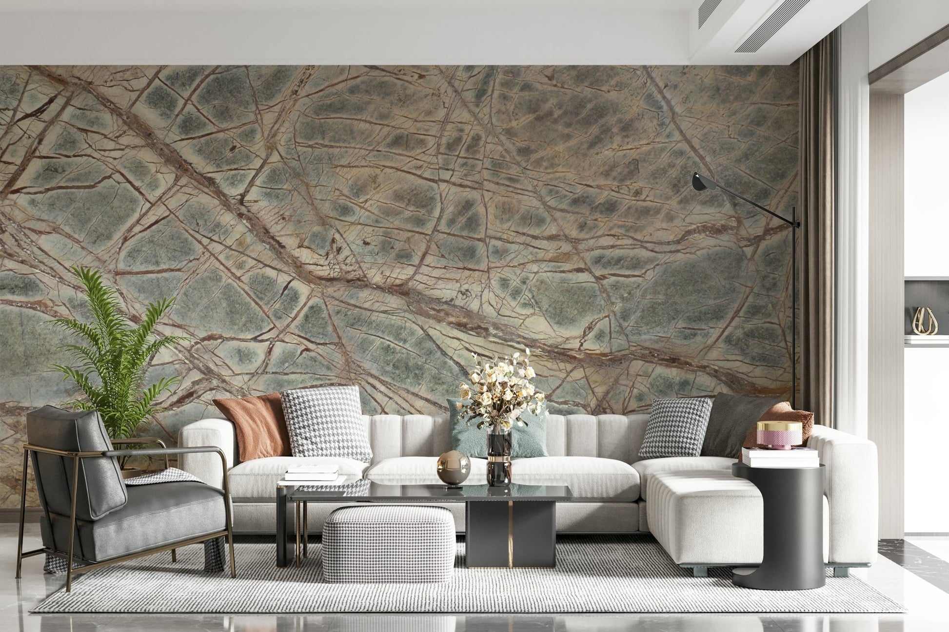 Bring the serenity of nature indoors. This captivating design mimics the intricate patterns of marble with a forest-inspired palette. Veins of russet traverse a canvas of subtle greens and beige, lending a sophisticated touch to any space. Install this wallpaper for walls in your living room to enrich the space. It also makes an elegant choice for a refined bedroom or a welcoming hallway. Let its organic beauty enrich your interior decor with natural charm.