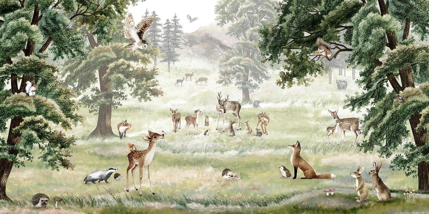 Forest-themed wallpaper murals with deer, foxes, and trees