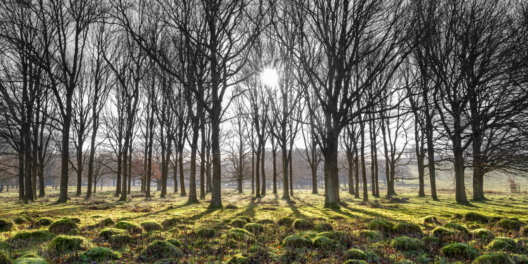 The Forest Illumination Wall Mural captures the stark beauty of a winter woodland with sunlight streaming through the bare tree branches. The long shadows stretch across a mossy, light-dappled foreground, giving depth and high contrast to the scene. This dramatic mural wallpaper provides a striking, realistic focal point for any room. Simple to apply, this high-quality wallpaper for walls offers a durable and impressive display. Use this unique wall mural to introduce a peaceful, graphic energy and the beautiful geometry of nature into your living space or office.