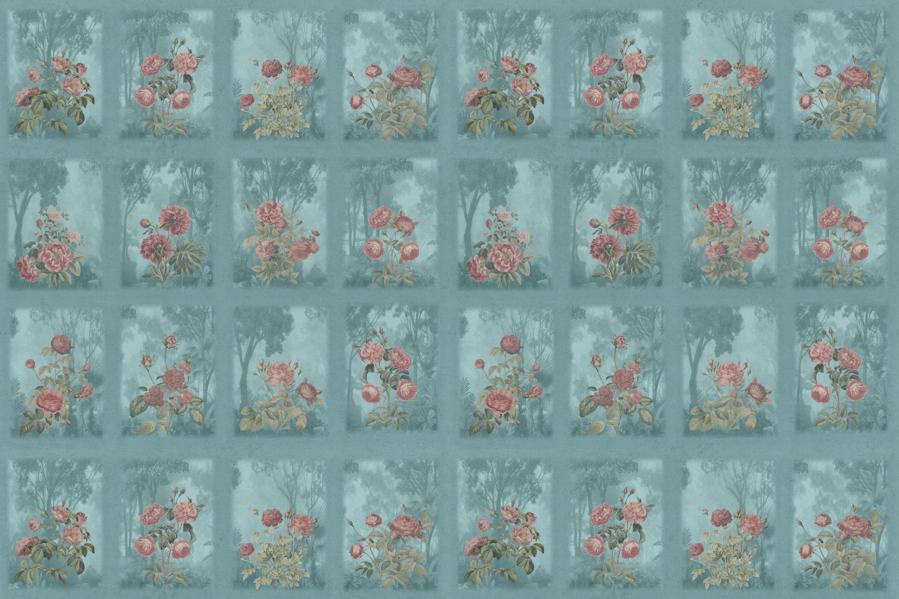 Transform your walls with this evocative wallpaper for walls featuring roses within a misty forest scene. Its soft teal palette creates a calming and serene ambiance. The pattern seamlessly repeats, giving the illusion of endless, enchanting woods. Ideal for bedrooms, living rooms, or hallways, this design adds a touch of classic elegance and invites tranquility into any space. The detailed floral arrangements and muted backdrop work well to complement both modern and traditional décor, giving your rooms a sophisticated, natural feel.