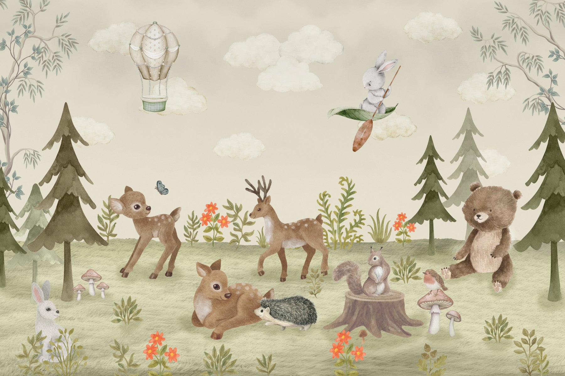 Dive into the world of make-believe with this forest tales wallpaper for walls. Soft watercolor animals like deer, bears, squirrels, and rabbits gather in a gentle forest scene. A hot air balloon drifts among the clouds. The calming color scheme of soft greens, browns, and beiges creates a peaceful ambiance. It is a delightful addition to nurseries, kids' rooms, and playrooms. This design complements interiors with a blend of nature-inspired charm and storybook whimsy.