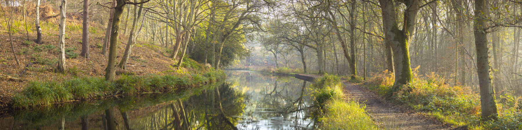 Canal through forest in countryside. Bring the serenity of nature indoors with this captivating wallpaper for walls. The image shows a calm waterway winding through a lush forest. Sunlight filters through the trees, casting a warm glow on the scene. The colors are a blend of soft greens, earthy browns, and subtle hints of gold. The design adds depth and dimension, perfect for creating a relaxing atmosphere in bedrooms, living rooms, or offices. Its natural aesthetic complements a range of interior styles.
