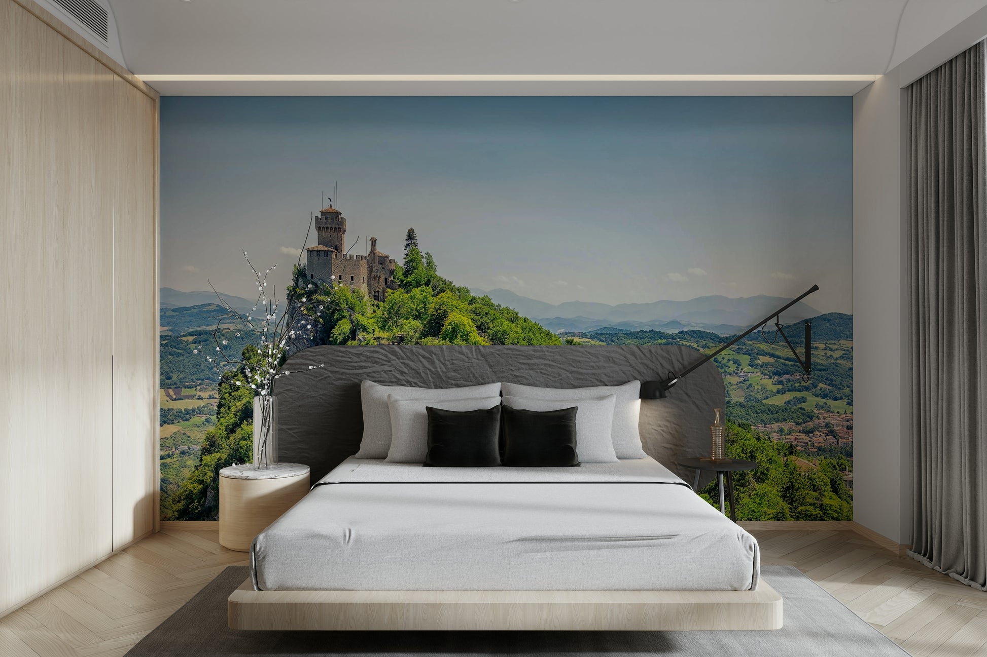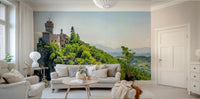 This captivating wallpaper features an ancient fortress dramatically set against a backdrop of rolling hills. Greenery covers the foreground, with distant mountains blurring into the light-blue horizon. The mix of architectural and natural elements brings a touch of old-world wonder to modern living spaces. Employ this sophisticated wallpaper for walls in your entryway, living room, or library to establish a focal point that connects the outdoors and indoors with stunning elegance.