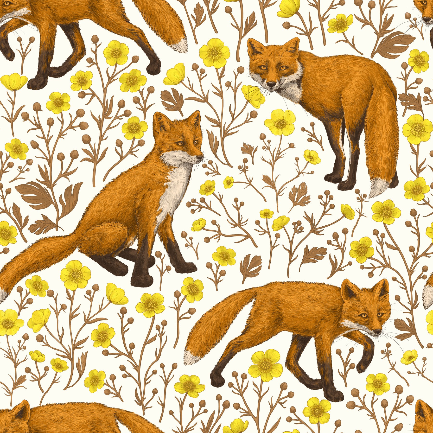 Foxes and buttercups on natural white Wallpaper⁠