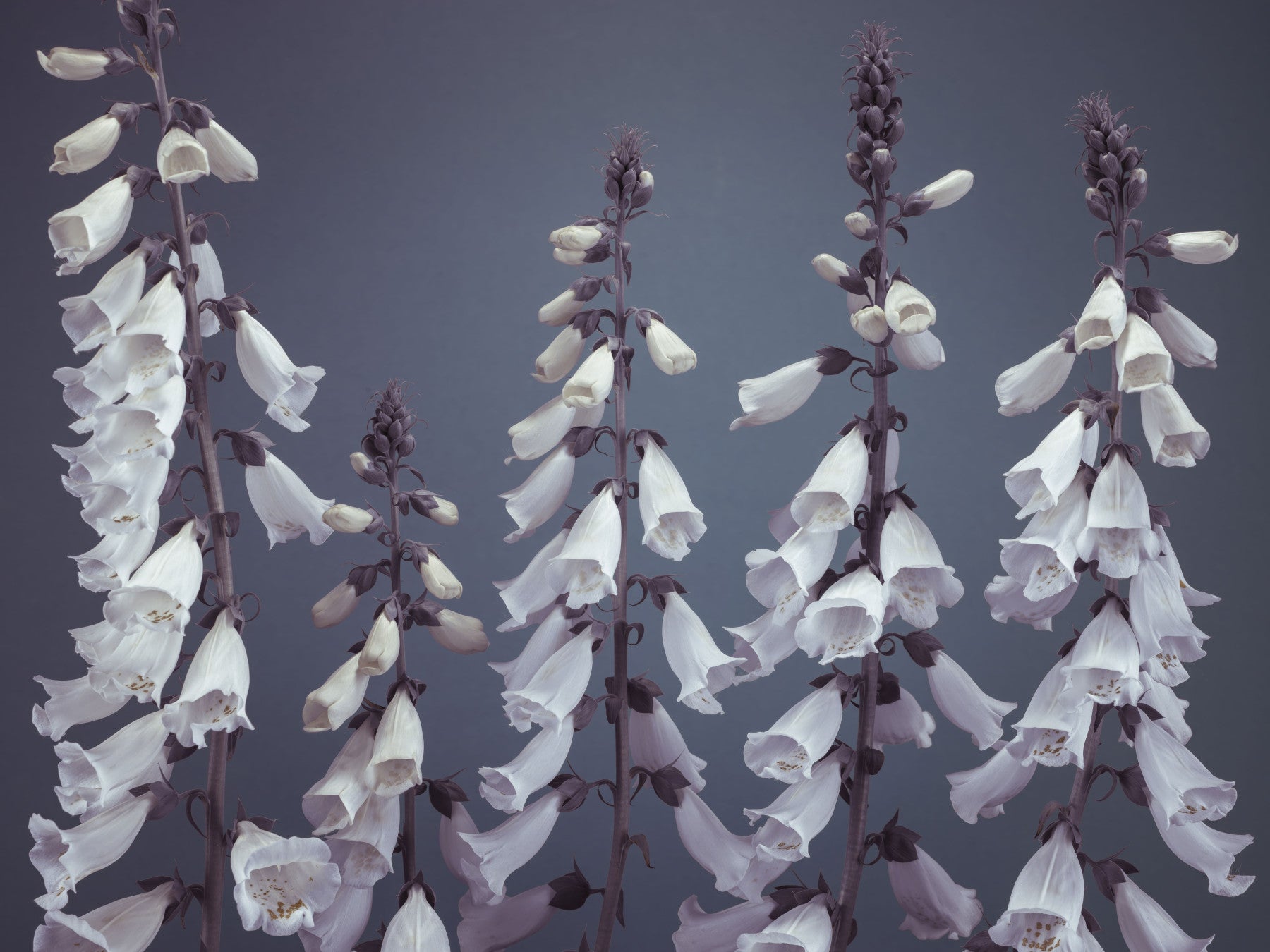 Foxglove Fantasy Wall Mural, tall white digitalis flowers on a gray background.
