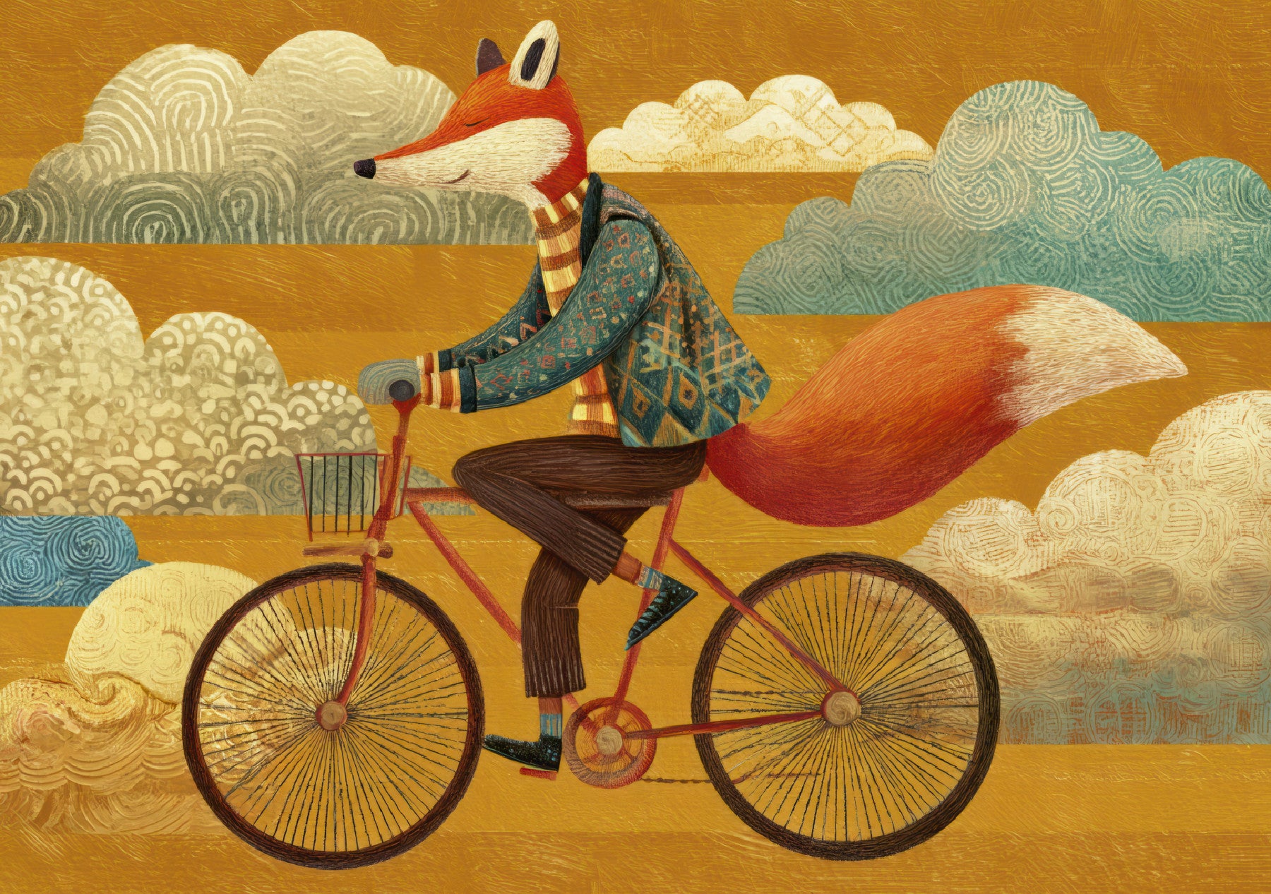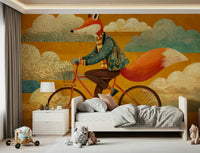 A whimsical illustration of a fox dressed in autumnal attire, riding a vintage bicycle across a textured, golden landscape. The clouds above are stylized and textured, adding depth and visual interest. Warm, earthy tones dominate the palette, creating a cozy and nostalgic mood, perfect for a living room or bedroom. The hand-drawn style and charming character add a touch of playful sophistication, making it a delightful piece for any space that needs a unique and cheerful touch. The image blends elements of folk art and illustration, adding an authentic and original feel.
