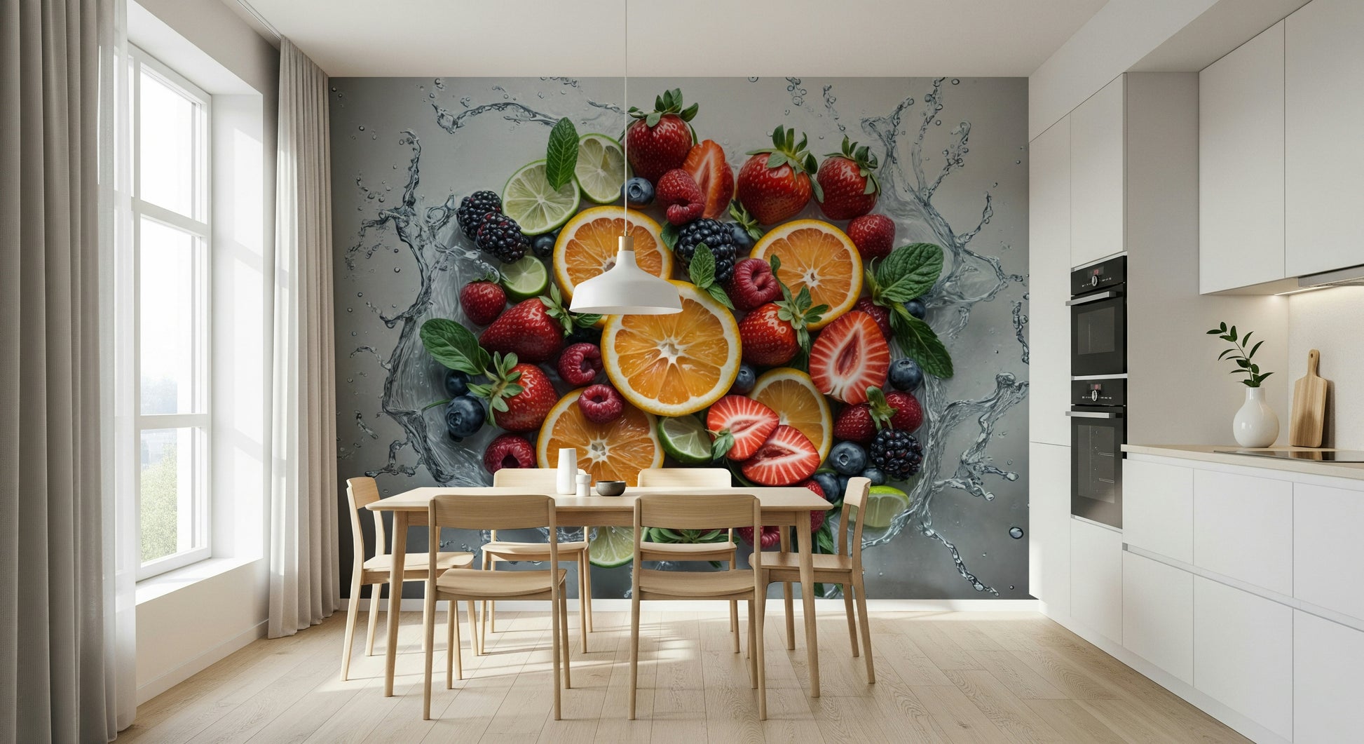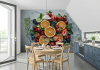 Invigorate your walls with this refreshing fruit medley. This wallpaper for walls bursts with vibrant oranges, juicy strawberries, plump blueberries, and tangy limes, all captured in a dynamic splash of water. The cheerful color palette brings energy to kitchens, dining rooms, or breakfast nooks. The design feels modern and clean, offering a revitalizing backdrop. It's an excellent choice to make a statement. Brighten your living space with this delicious and visually appealing wall décor. This image offers a playful yet stylish touch.