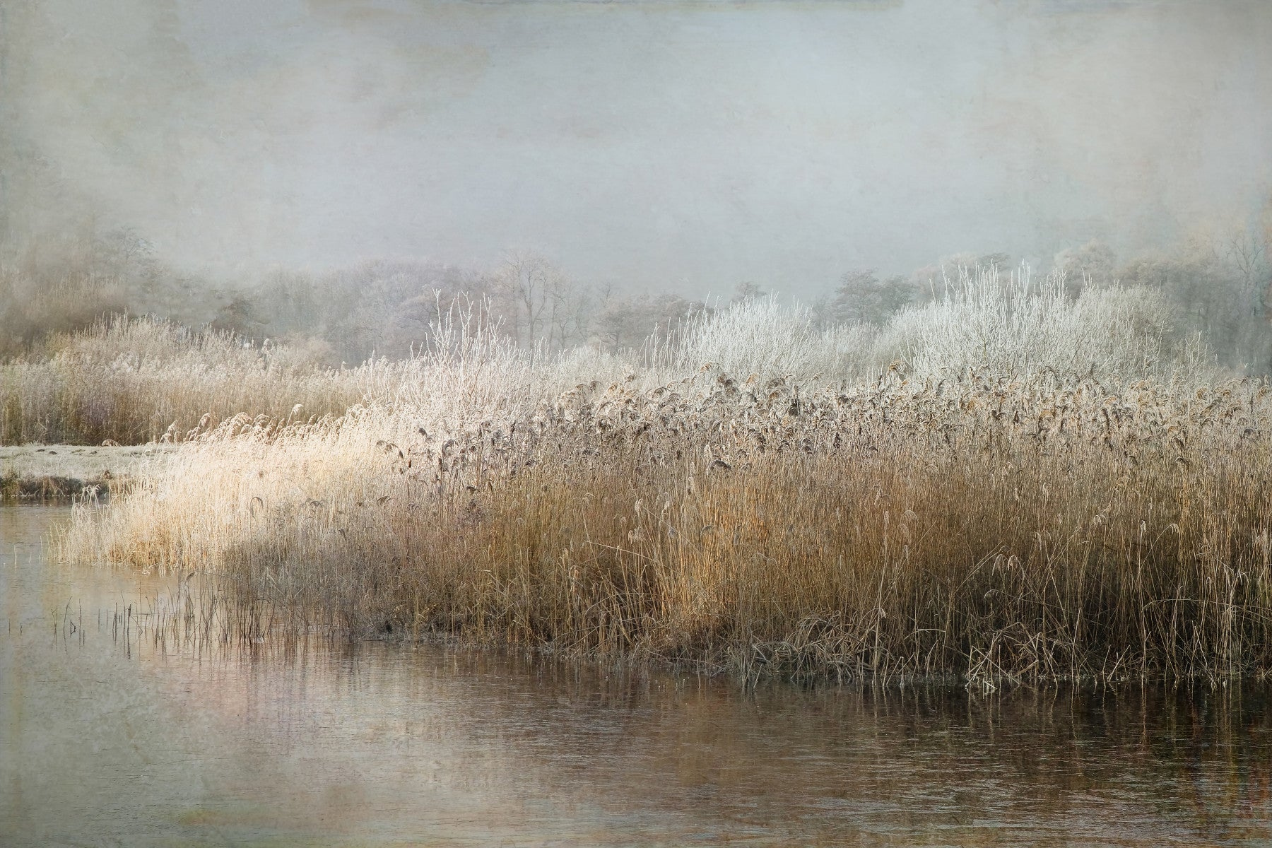 Invite the serene beauty of a winter morning into your home with this wallpaper. The design features a tranquil riverbank scene. Silvery light graces frost-kissed reeds and trees, evoking a sense of peace and stillness. The muted tones and soft textures bring a subtle sophistication to any room. This wallpaper for walls works wonderfully in a bedroom, living room, or hallway, creating a calming backdrop that complements both modern and rustic decor styles.