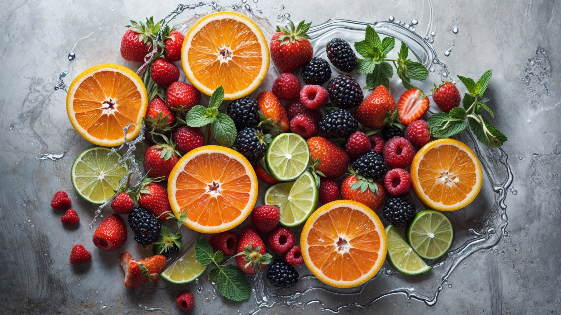 The fruits are shown in a splash of liquid or with a sense of motion.