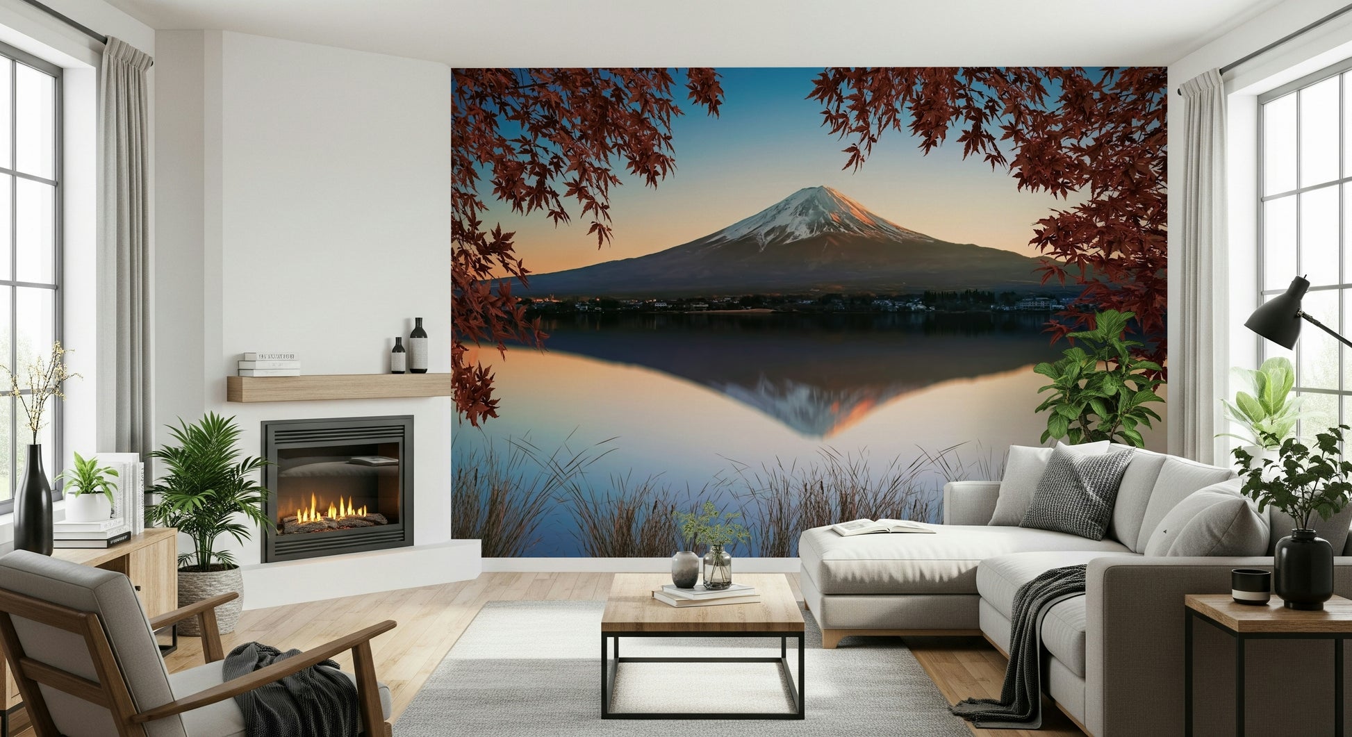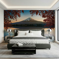 Transform your walls with the majestic beauty of Mount Fuji bathed in dawn's gentle light. This scenic wallpaper showcases the iconic mountain reflecting perfectly in a still lake. Crimson maple leaves frame the view, injecting warmth into the cool, tranquil scene. Use this wallpaper for walls to create a calm and inviting atmosphere. Perfect for the bedroom or living space, this design complements minimalist or nature-inspired interiors. Invite the beauty of the Japanese landscape into your home.