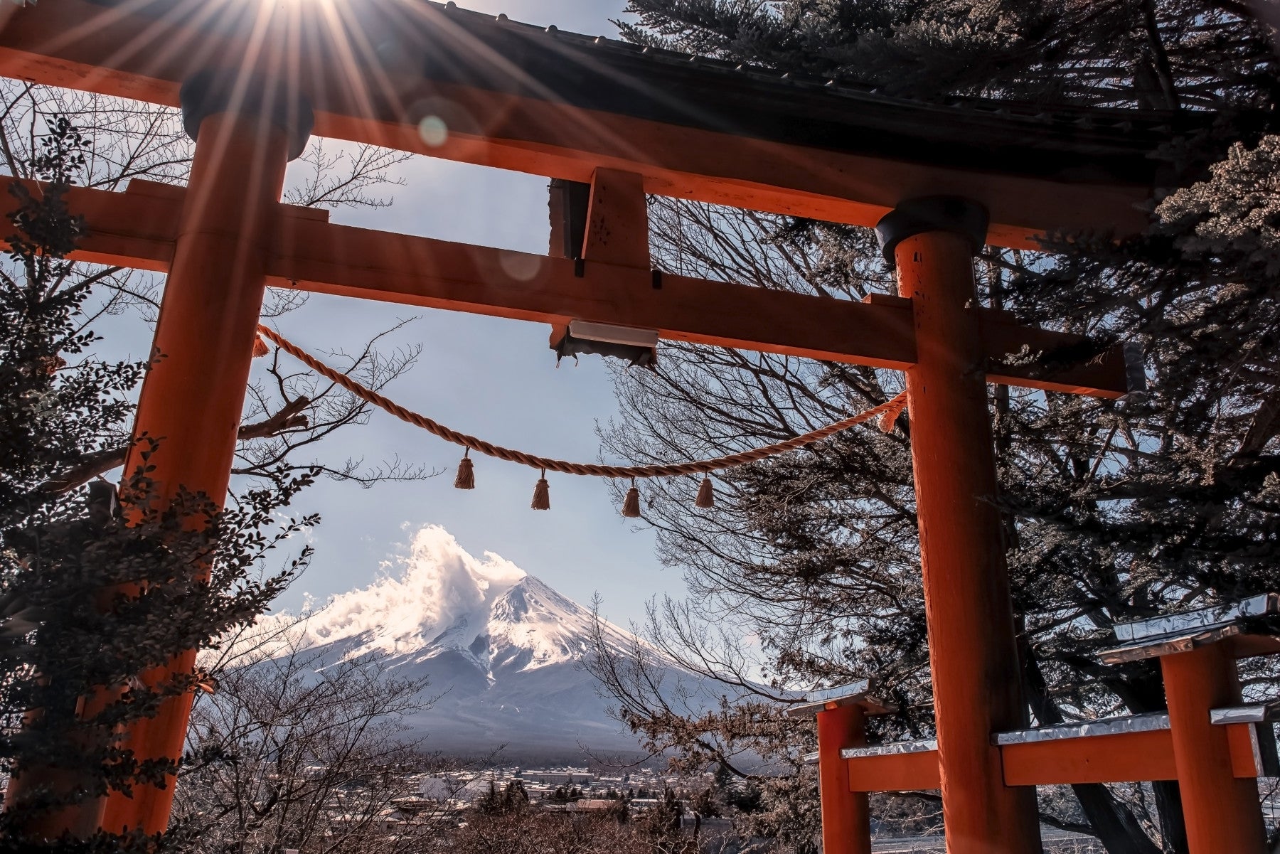 Capture a sense of serenity with this striking wallpaper for walls. This image showcases a vibrant orange torii gate against the backdrop of Mount Fuji. The sun bursts through the sky, filling the scene with warmth. The contrasting black branches add texture, while the snow-capped mountain offers a tranquil escape. This wallpaper brings a touch of Japanese beauty to your living room, bedroom, or hallway, creating a peaceful and refined ambiance. This photo will complements minimalist or nature-inspired interiors.