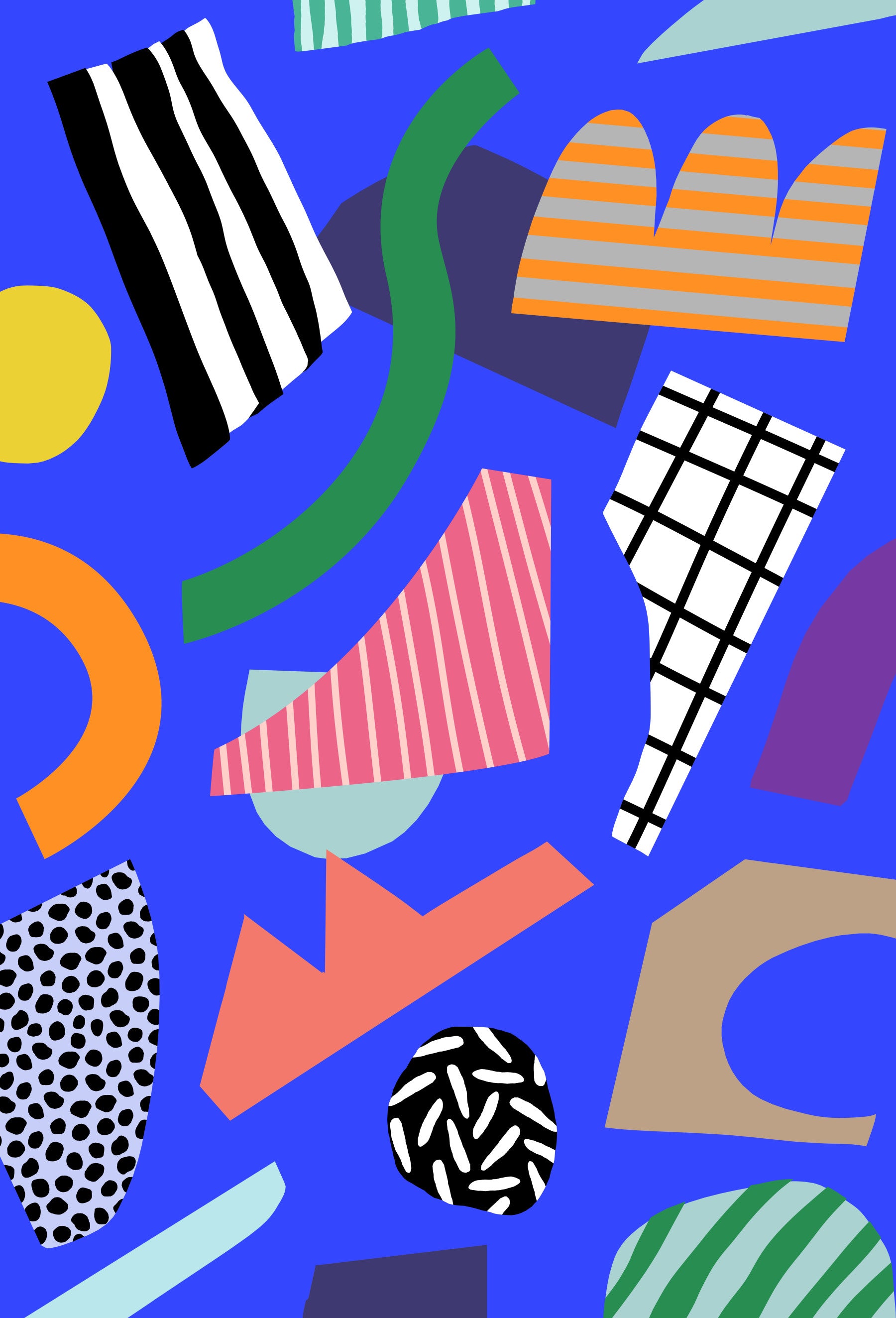 Immerse yourself in the vibrant energy of Fullness a dynamic wallpaper that celebrates abundance and joyful complexity. Against a deep blue backdrop, a playful assortment of geometric shapes and patterns collide in a harmonious dance. Bold stripes, whimsical polka dots, and free-flowing lines create a sense of lively interaction, inviting the eye to explore every corner of the composition. The diverse color palette, featuring cheerful oranges, pinks, greens, and contrasting blacks and whites, adds a touch of exuberance and spontaneity. 'Fullness' is more than just a visual treat; it's a reminder to embrace the richness and diversity of life, filling your space with positivity and a sense of complete, overflowing joy. Let this vibrant wallpaper inspire you to live a life filled to the brim.
