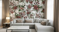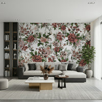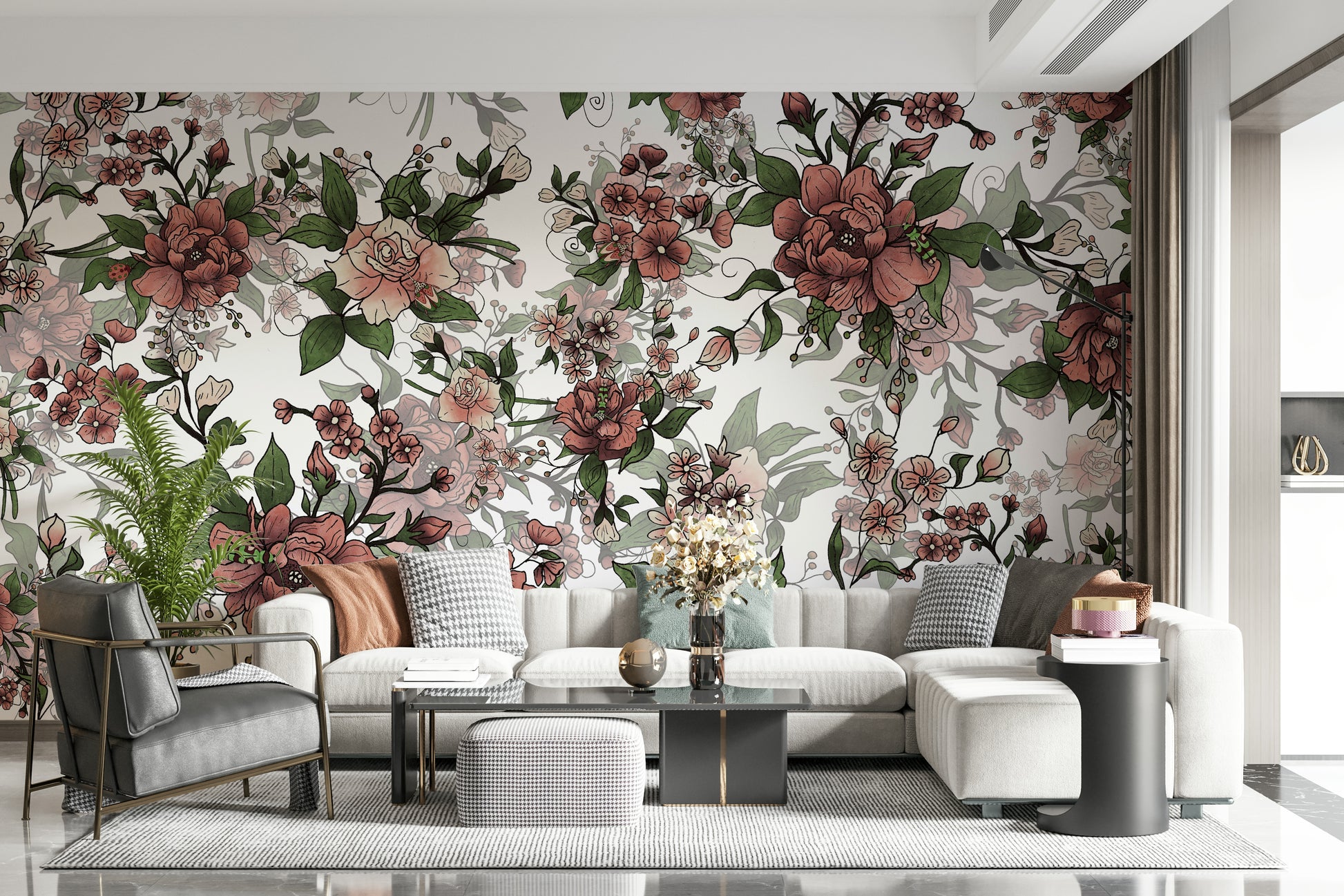 Transform your space with this inviting floral wallpaper. The design features a seamless arrangement of roses and leaves in a muted, earthy palette. Notice the intricate lines that offer a hand-drawn charm. This wallpaper for walls will enhance various rooms such as living rooms, bedrooms, or dining areas. The subtle design easily complements both contemporary and traditional interiors, bringing a touch of nature indoors. The floral pattern introduces a graceful atmosphere, making your interior feel relaxed and stylish.