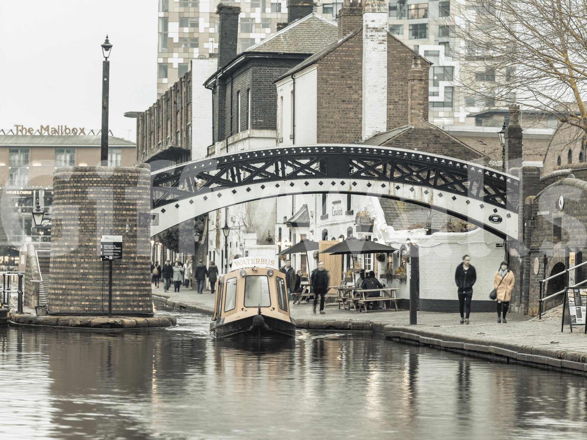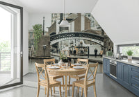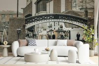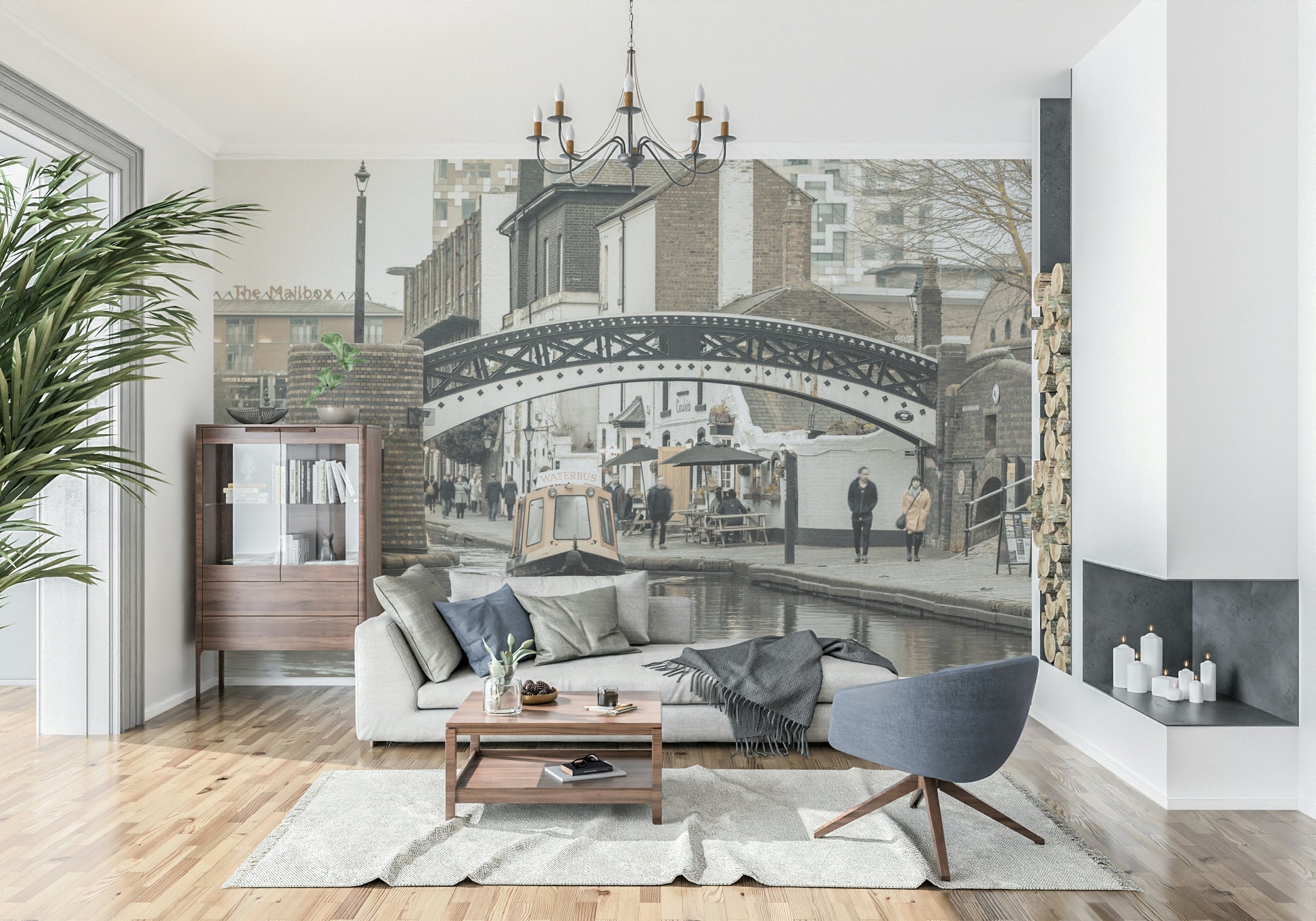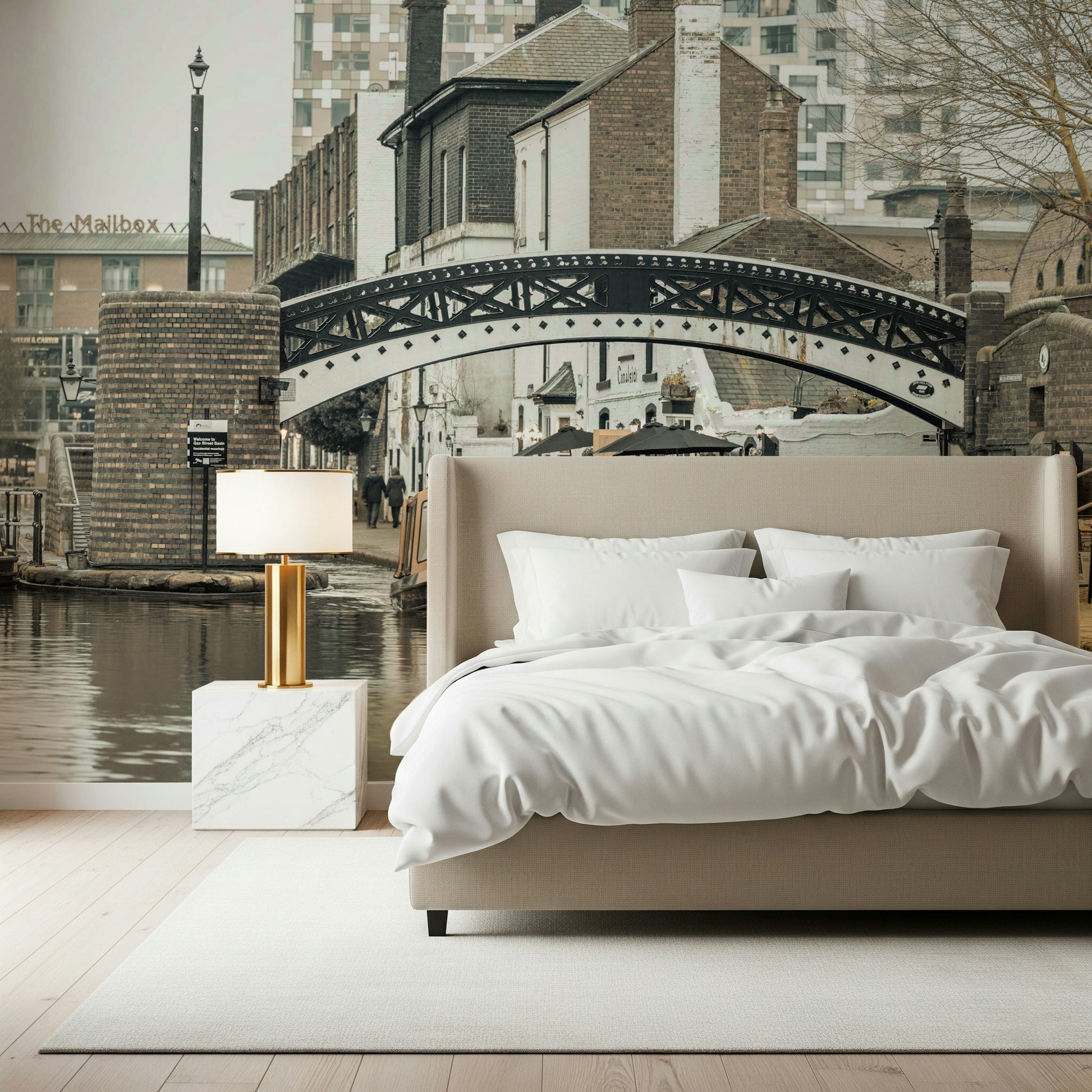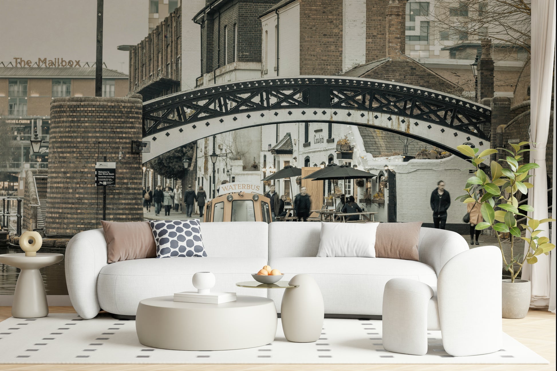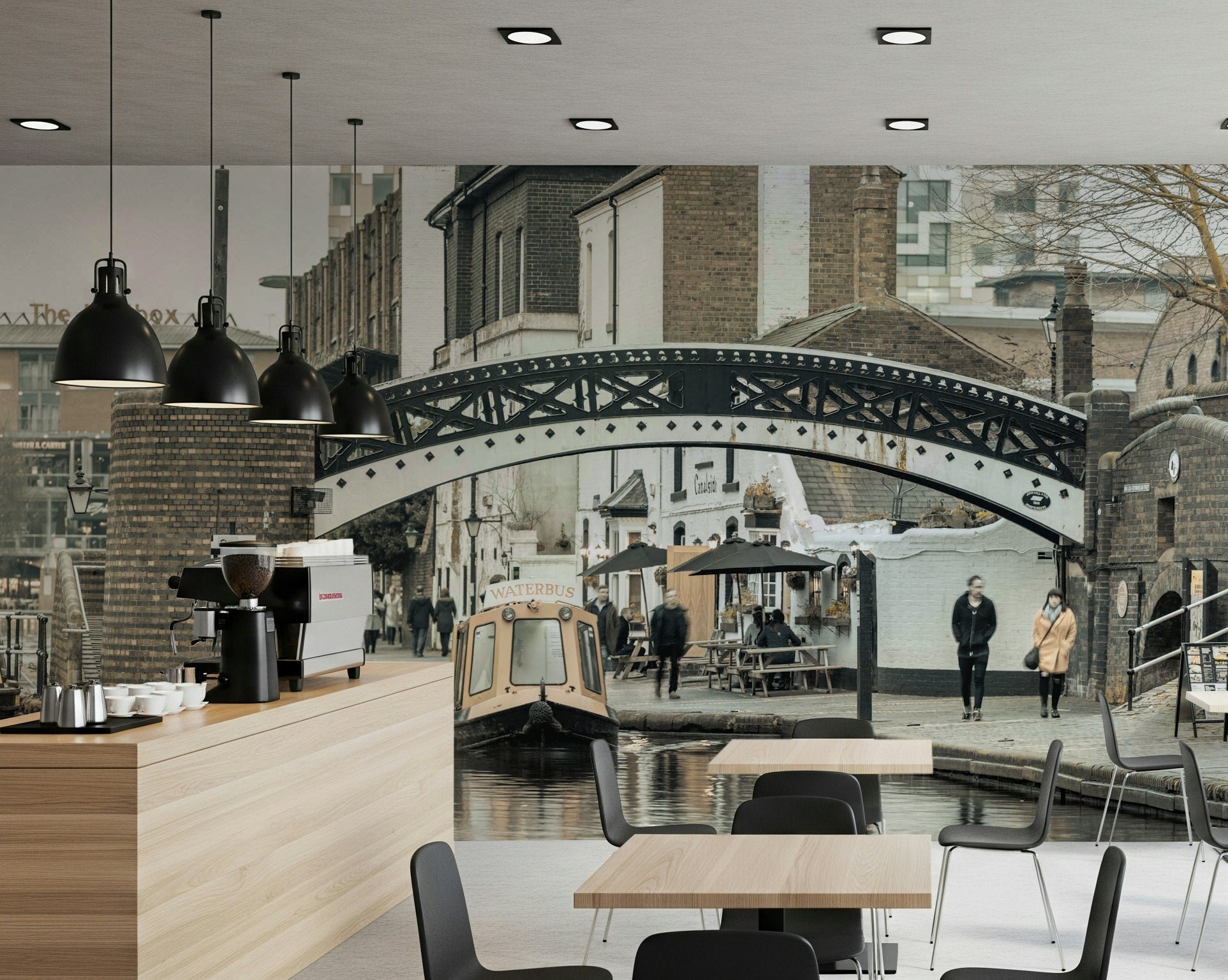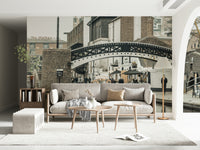 Bring the beauty of Birmingham's Gas Street Basin into your home. See a scenic canal view, complete with a 'waterbus' and historic buildings. The wallpaper showcases muted tones and detailed brickwork, creating a calming effect for any space. It will transform any room into an artistic display with its peaceful, urban design. Consider it as wallpaper for walls for an industrial or minimalist room design. This piece looks great in a living room, hallway, or study, adding depth and a touch of local flavor.
