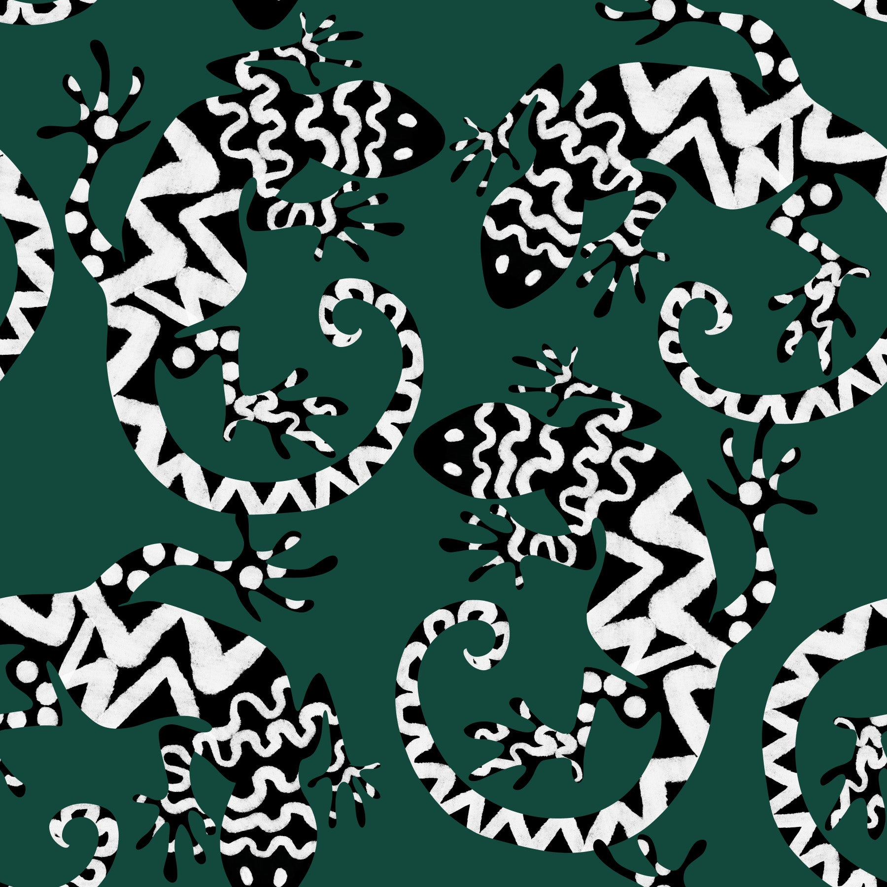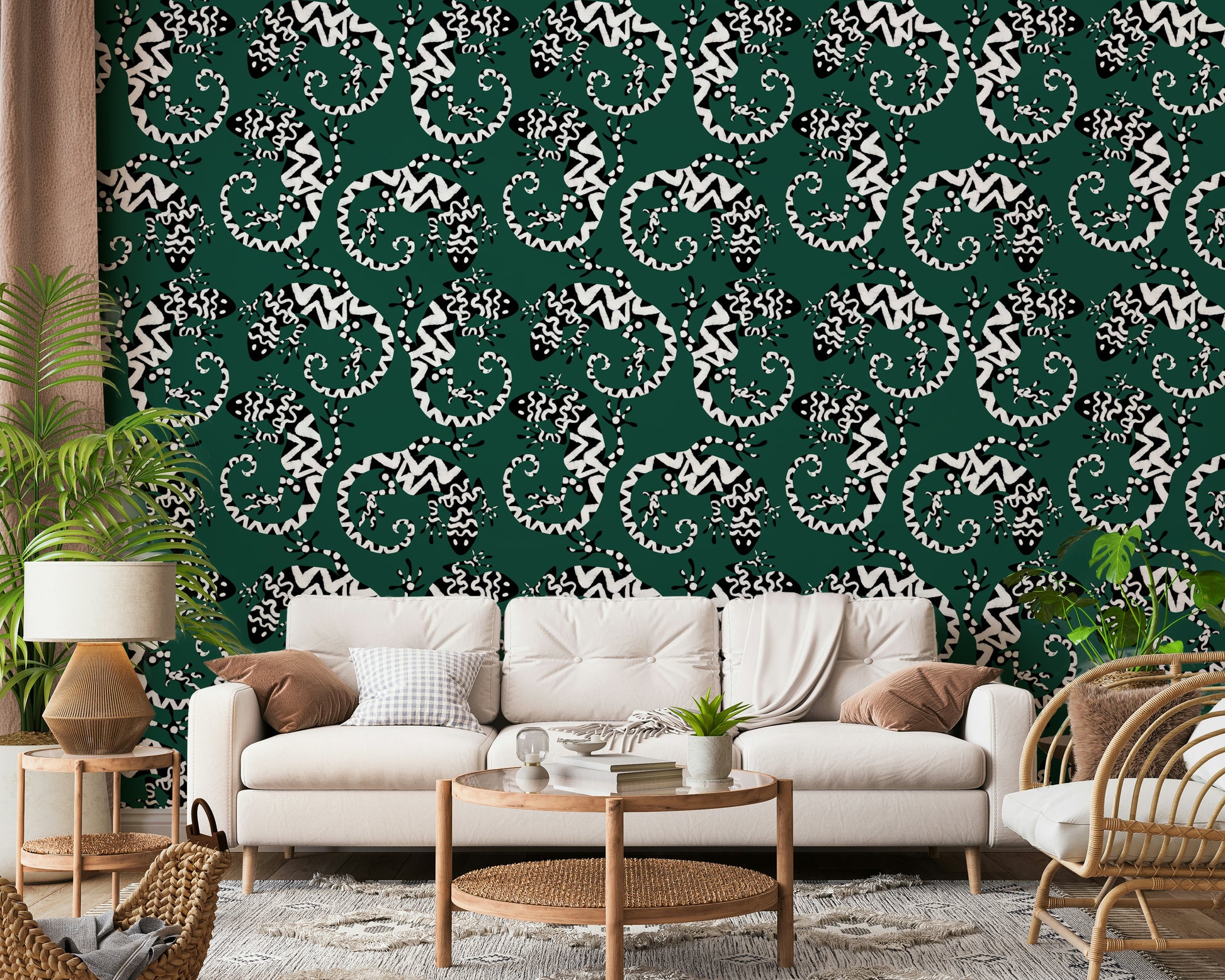 Transform any room with this striking gecko-inspired wallpaper for walls. The graphic black and white pattern against a deep green background brings a touch of exotic flair. The stylized lizards create a lively, repeating motif that is both modern and timeless. Ideal for adding personality to living rooms, hallways, or even bathrooms, this design works particularly well in spaces seeking a touch of whimsy. It adds visual interest without overwhelming the space, complementing both minimalist and maximalist interior styles. The pattern's bold contrast enhances the sense of depth, making smaller rooms feel more expansive.