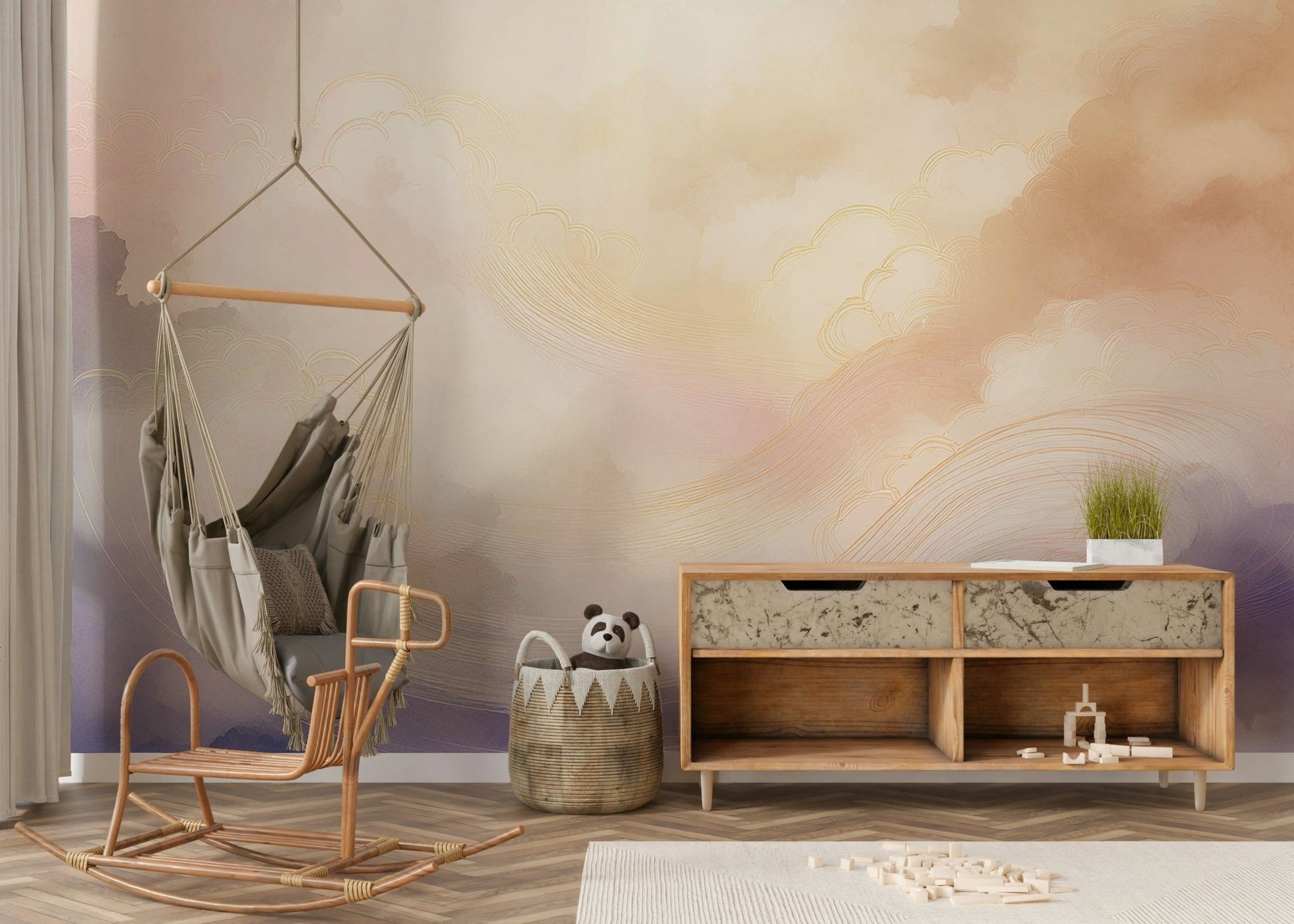 Dreamy sky mural for calming bedroom walls.