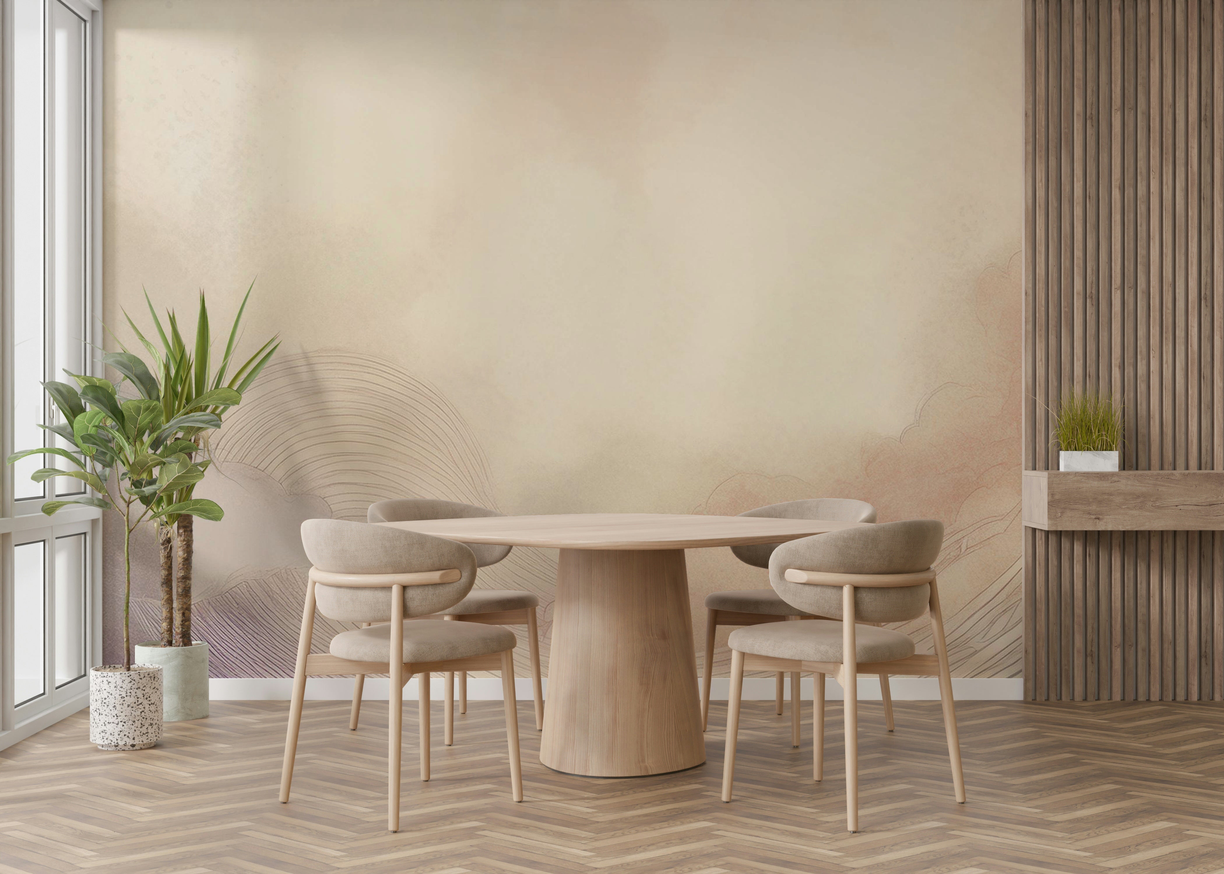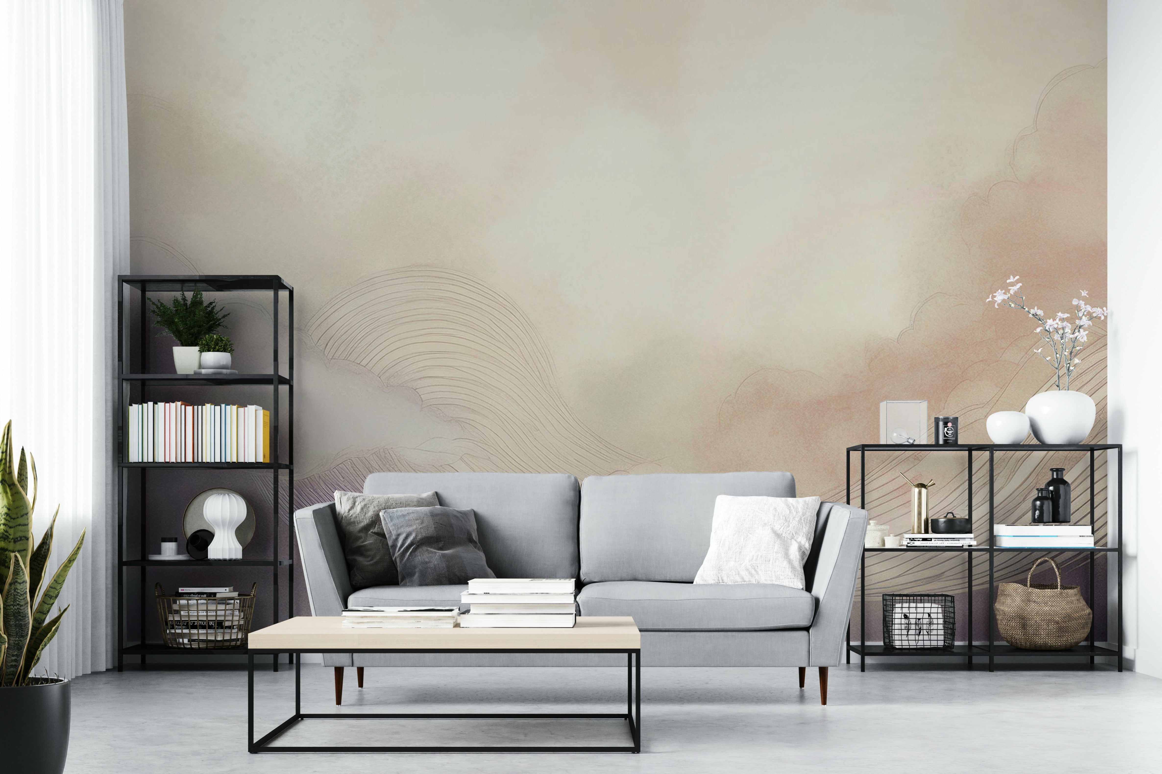 This ethereal wallpaper captures the serene beauty of a dreamy landscape. Soft, muted tones of beige, lavender, and blush pink create a calming atmosphere. Delicate, hand-drawn lines depict flowing clouds, evoking a sense of tranquility and peace. The subtle watercolor effect adds depth and texture, making it perfect for bedrooms, meditation spaces, or any room seeking a peaceful ambiance. Its minimalist design is both elegant and versatile, complementing various interior styles. The gentle color palette promotes relaxation and a sense of calm, making it ideal for a tranquil retreat.