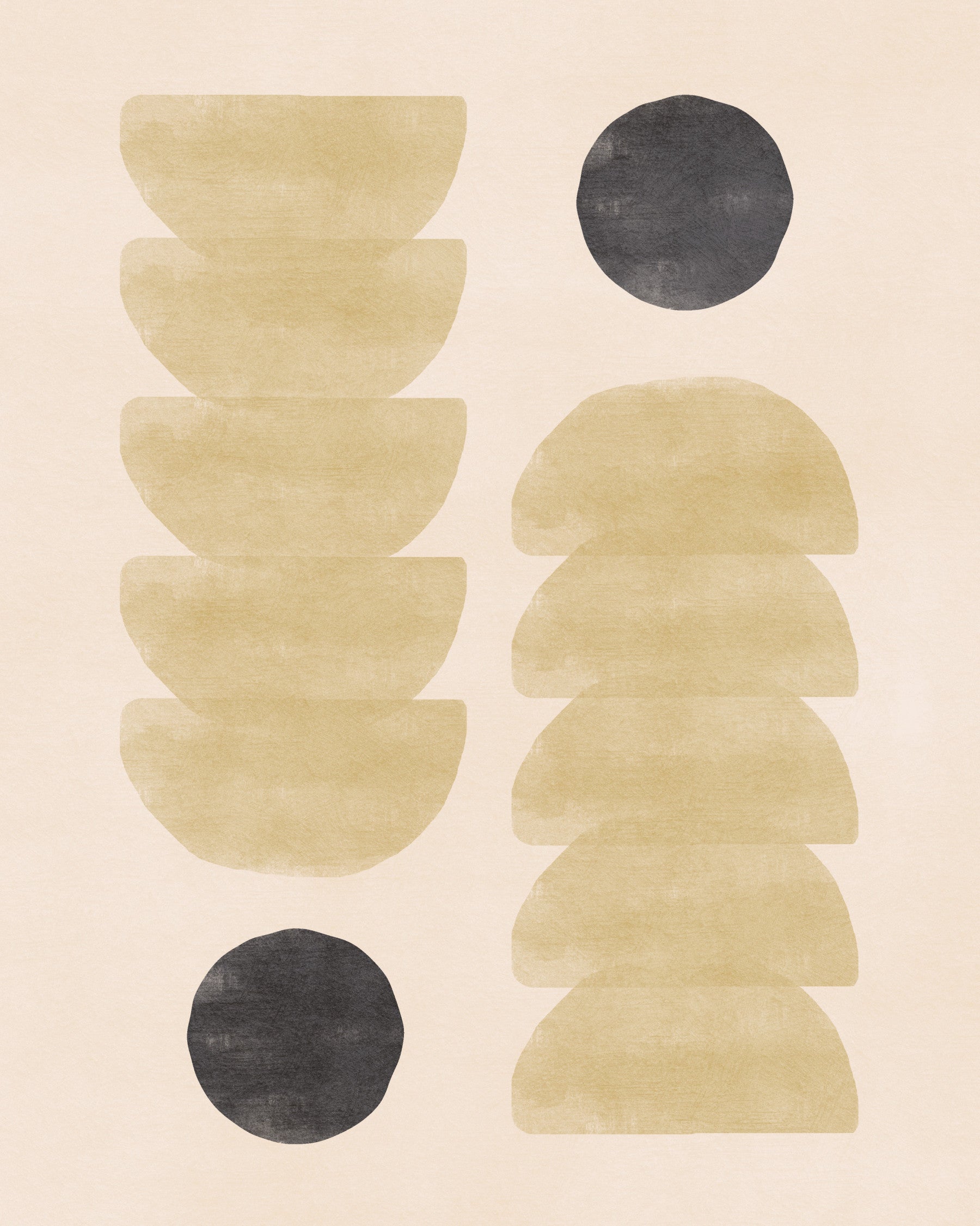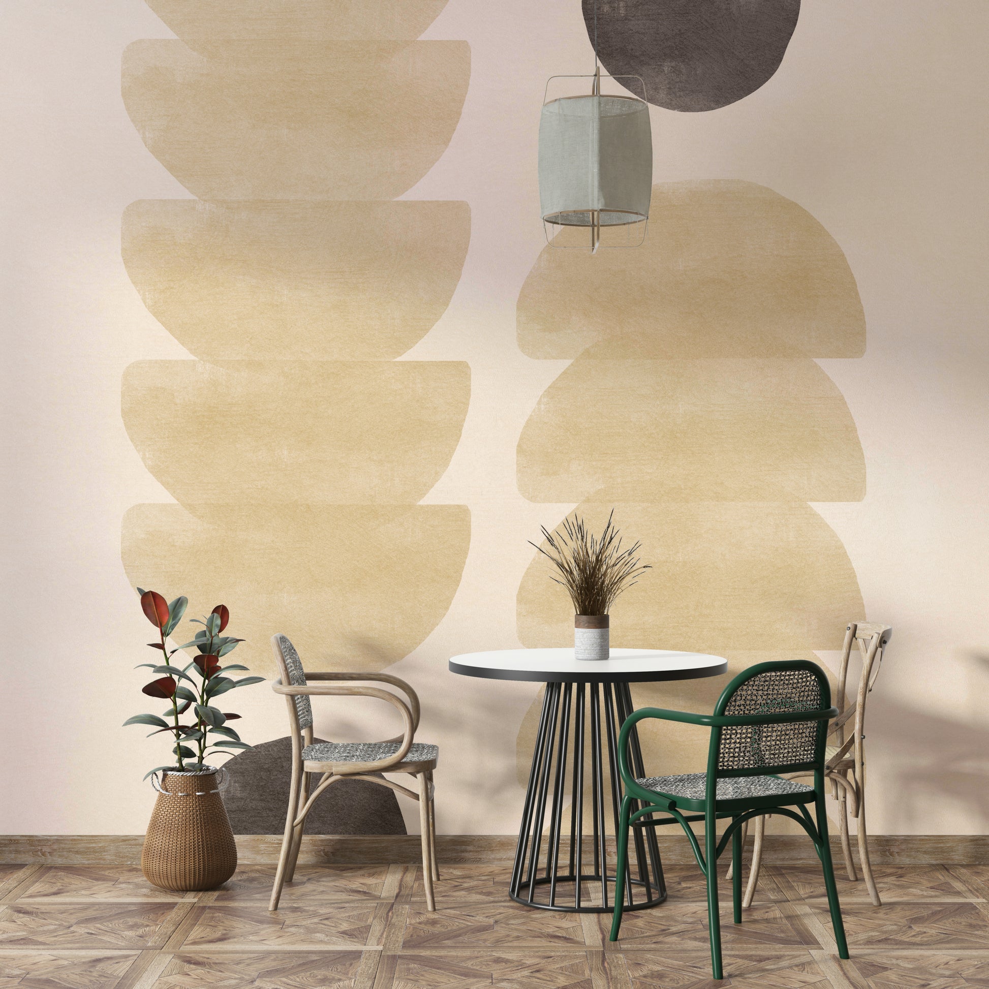Find your center with this geometrically inspired wallpaper. The design utilizes a palette of creamy beige and charcoal grey, creating a sophisticated and serene atmosphere. The stacked semi-circular forms, paired with the contrasting circles, invite contemplation and mindfulness. The gentle color transition and smooth textures create a calming effect. This wallpaper is ideal for spaces where tranquility and balance are desired, such as bedrooms, yoga studios, or meditation rooms. Its versatility allows it to complement various design aesthetics, from minimalist to modern.