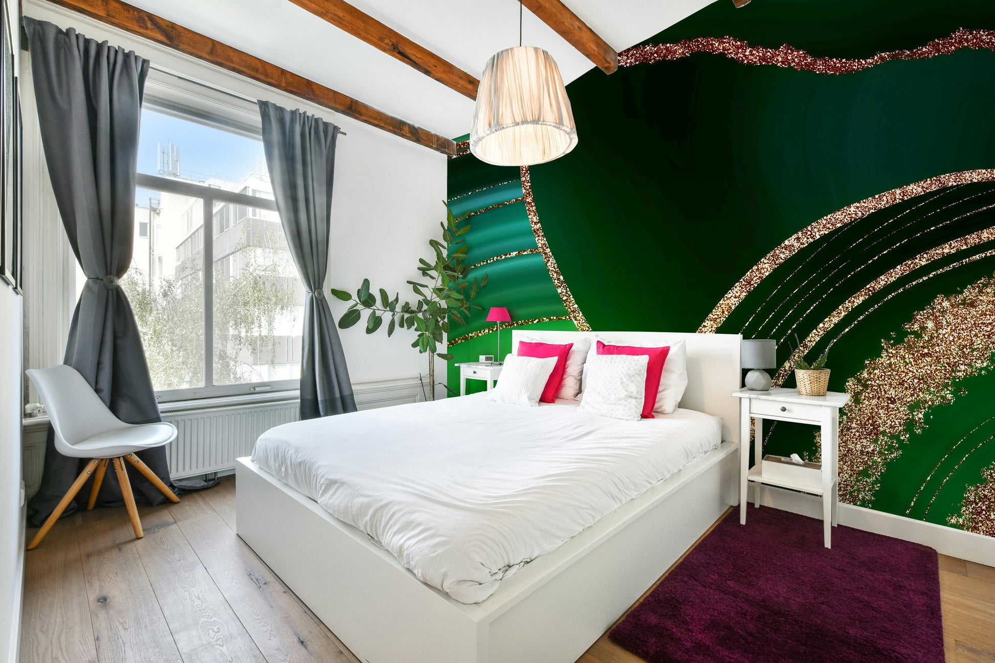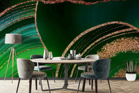 Infuse your home with the rich tones of this opulent emerald and gold wallpaper. Its swirling designs and radiant glitter create an abstract pattern that adds a touch of modern sophistication to any space. The deep green tones provide a grounding effect. This wallpaper for walls looks amazing in a hallway or living area. Use it to create a bold statement wall in the master bedroom. The interplay of color and sparkle makes it ideal for bringing a glamorous touch to modern interiors.