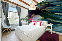 Capture the sophistication of abstract art with this intriguing design. A rich blend of jewel tones intermingles with glistening golden accents, creating depth and movement. The flowing lines and colors introduce a touch of luxury. Ideal for creating a statement wall in a living room, bedroom, or office. This wallpaper for walls transforms any space into a refined retreat. Let it bring artful energy to your interiors.