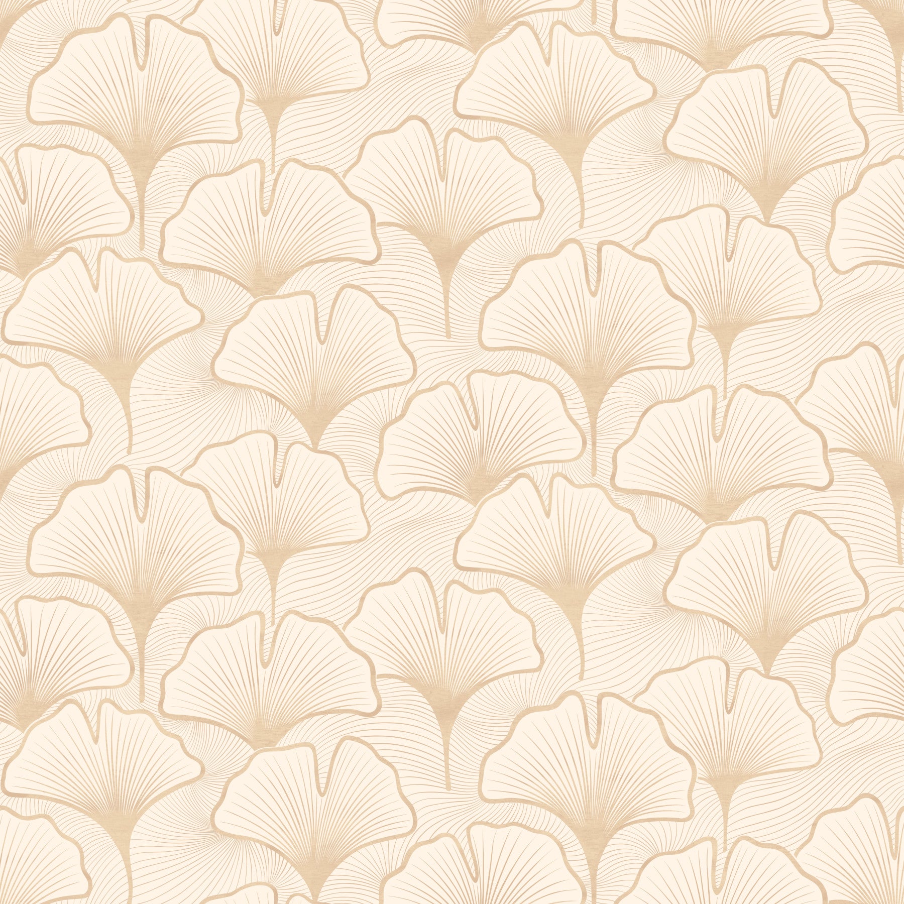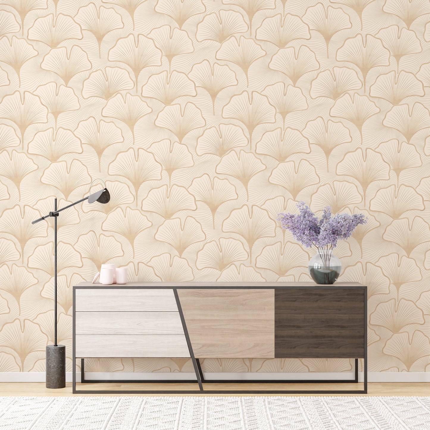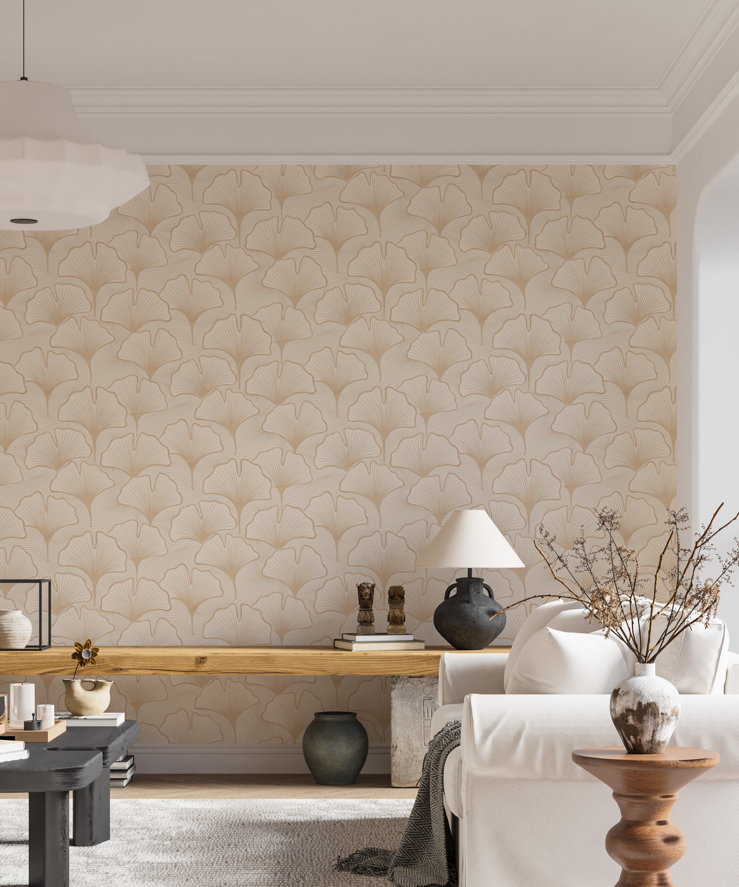This wallpaper showcases a sophisticated and calming design featuring intricately detailed ginkgo biloba leaves in a muted beige and gold color palette. The elegant line art creates a subtle yet striking pattern, perfect for adding a touch of understated luxury to any room. The seamless design flows effortlessly across surfaces, creating a serene and tranquil atmosphere. Ideal for modern, minimalist, or even zen-inspired interiors, this wallpaper evokes a sense of peace and sophistication without being overwhelming. Its understated beauty makes it a versatile choice for bedrooms, living rooms, or even offices.