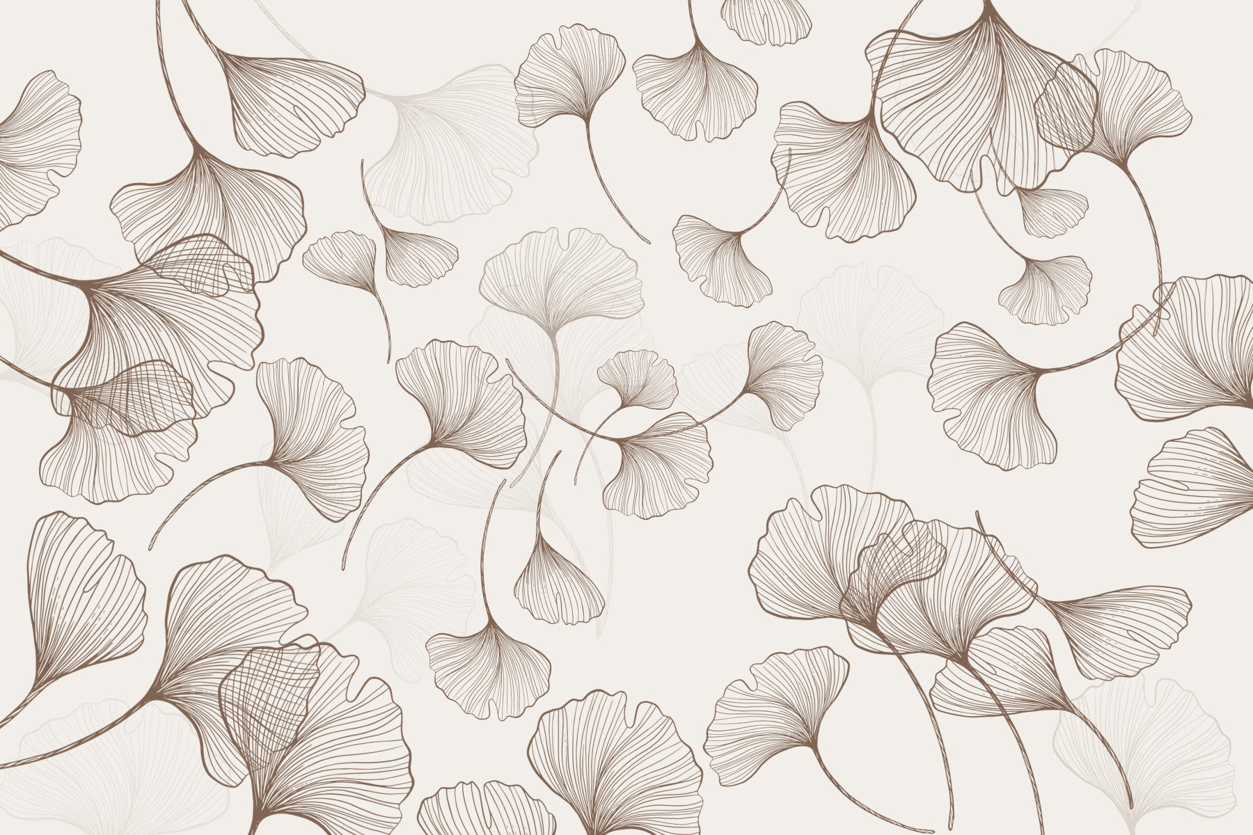 Delicate ginkgo leaves cascade across this wallpaper for walls, bringing a touch of nature indoors. Its neutral color palette presents soft beige and brown tones, creating a serene environment. The intricate line art adds a sophisticated touch, ideal for bedrooms, living rooms, or hallways. This design complements modern, minimalist, and Scandinavian interiors, offering a subtle pattern that enhances the room's tranquility without overpowering the existing décor.
