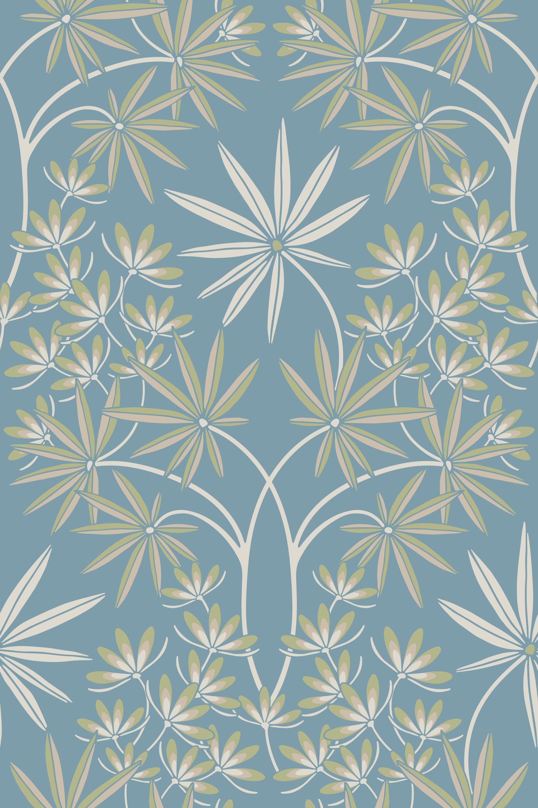 Immerse yourself in the gorgeous world of this Glamour floral damask wallpaper in a cottagecore Sage Green on Light Blue colourway. This floral tropical botanical pattern is an unapologetic celebration of Maximalism, referencing both Art Nouveau and opulent Jazz Age style, featuring sage green, cream and beige flowers and tropical leaves on a pastel light blue background in a delicate lacy damask layout. The symmetrical arrangement creates a sense of formal elegance, typical of damask patterns, with an exaggerated scale and gentle cottage color palette that is perfect for adding a touch of fresh energy to any space. This pattern design is also available in Other Colourways too! Original wallpaper pattern design by Jackie Tahara of UnBlink Studio.