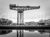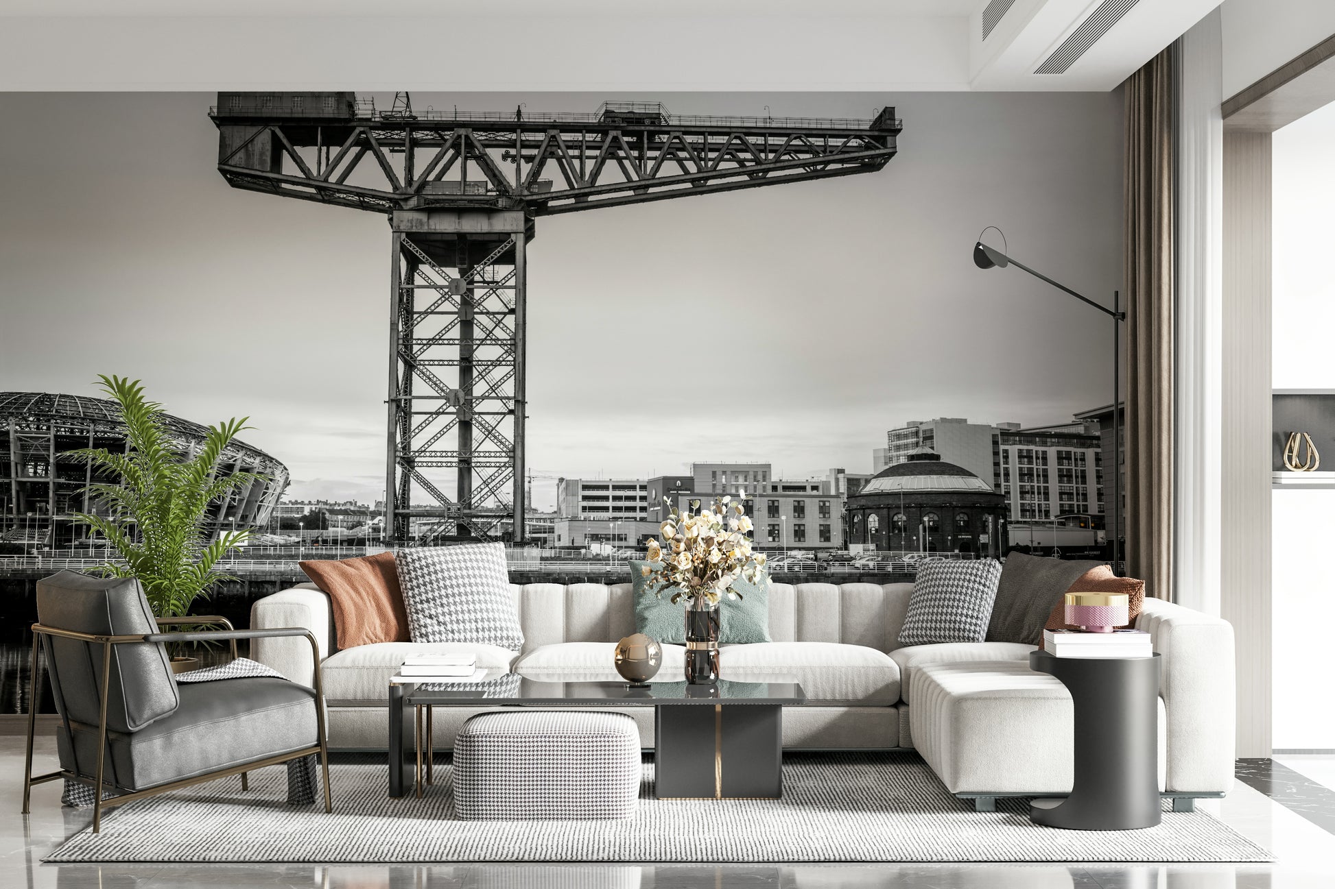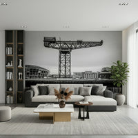 Finnieston crane on River Clyde, Glasgow. Transform your space with this industrial-inspired black and white wallpaper for walls. This design presents a stark, yet mesmerizing view of the Clydeport crane, set against the backdrop of the city's buildings and water. The high-contrast image creates a focal point. The reflections on the water add depth and movement to the scene. This image works perfectly in areas like a home office, modern dining room, or studio, enhancing spaces with an urban mood. It's a statement of strength and design.
