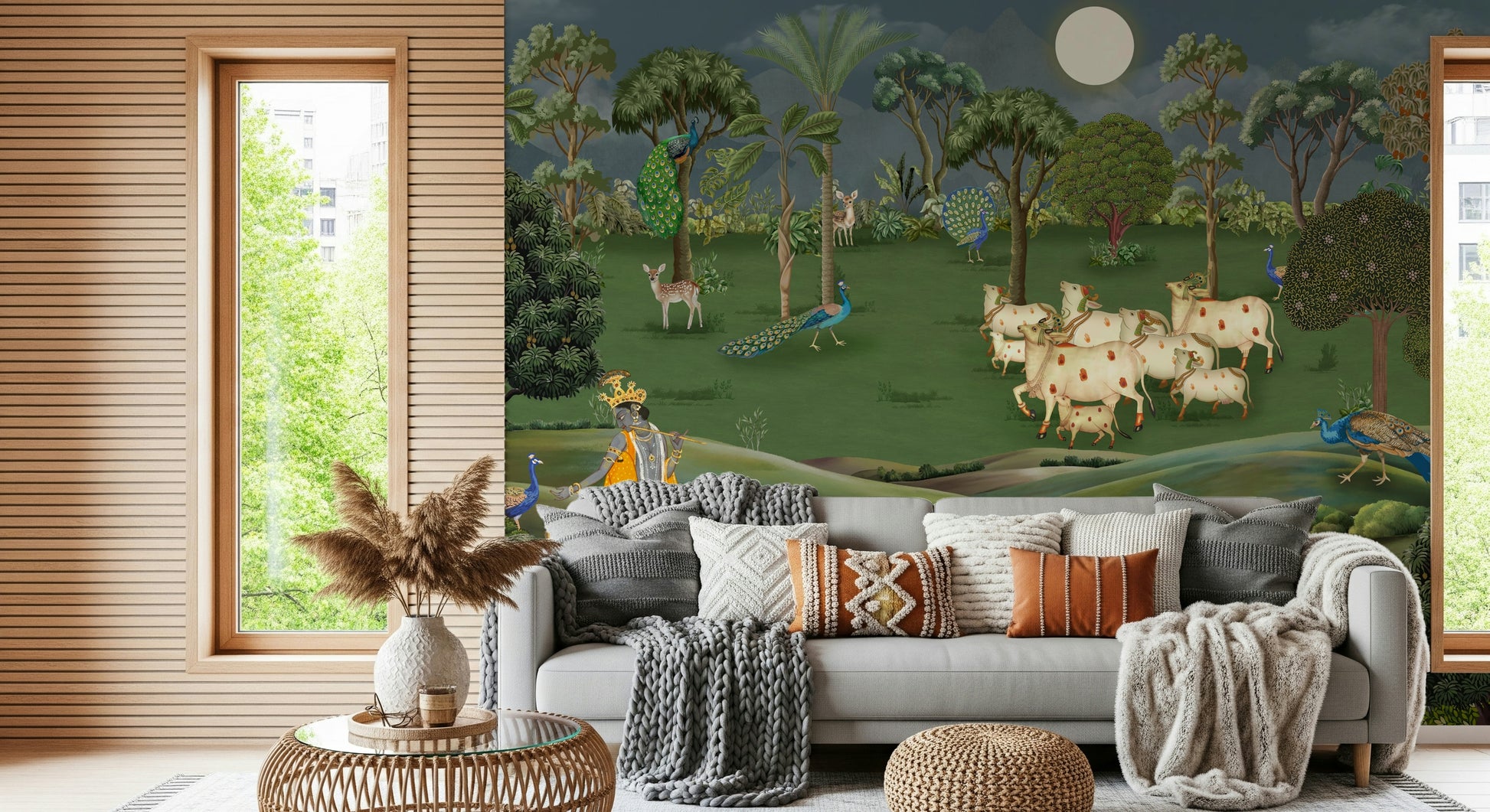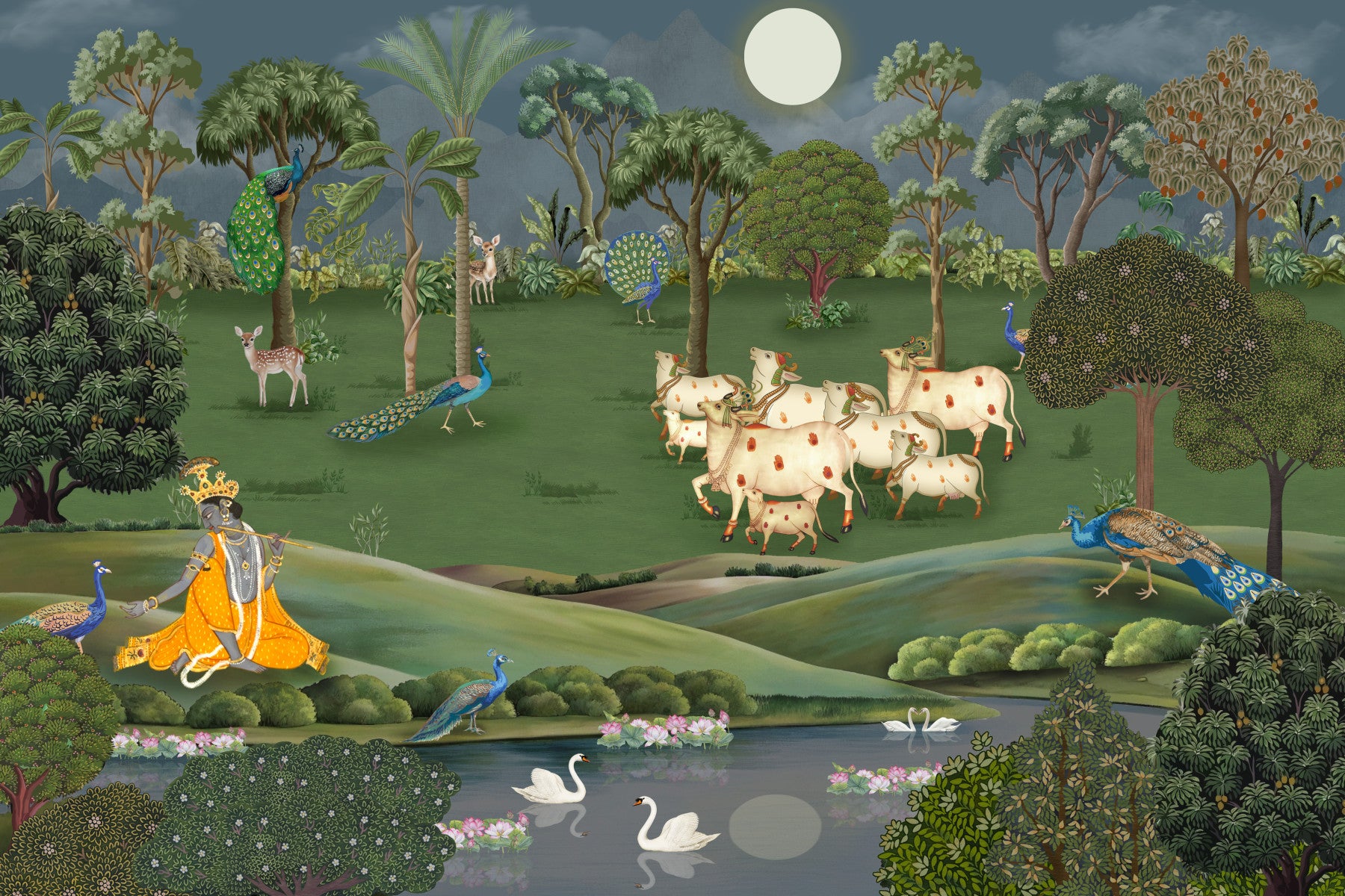 Transform your walls into a serene pastoral scene with 'Gokul Grazing'. This evocative scene transports you to a tranquil haven, depicting a herd of intricately adorned cows leisurely grazing under the soft glow of a full moon. Peacocks strut with regal grace across the lush landscape, their iridescent feathers adding vibrant splashes of colour to the verdant surroundings. A serene pond, graced by elegant swans and blooming lotuses, reflects the gentle moonlight, completing the idyllic picture. Infused with a sense of peace and harmony, and presenting a regal figure from Hindu mythology playing the flute, this artwork creates an atmosphere of spiritual bliss. Invite the beauty of nature and the charm of ancient legend into your home with this stunning wall art.