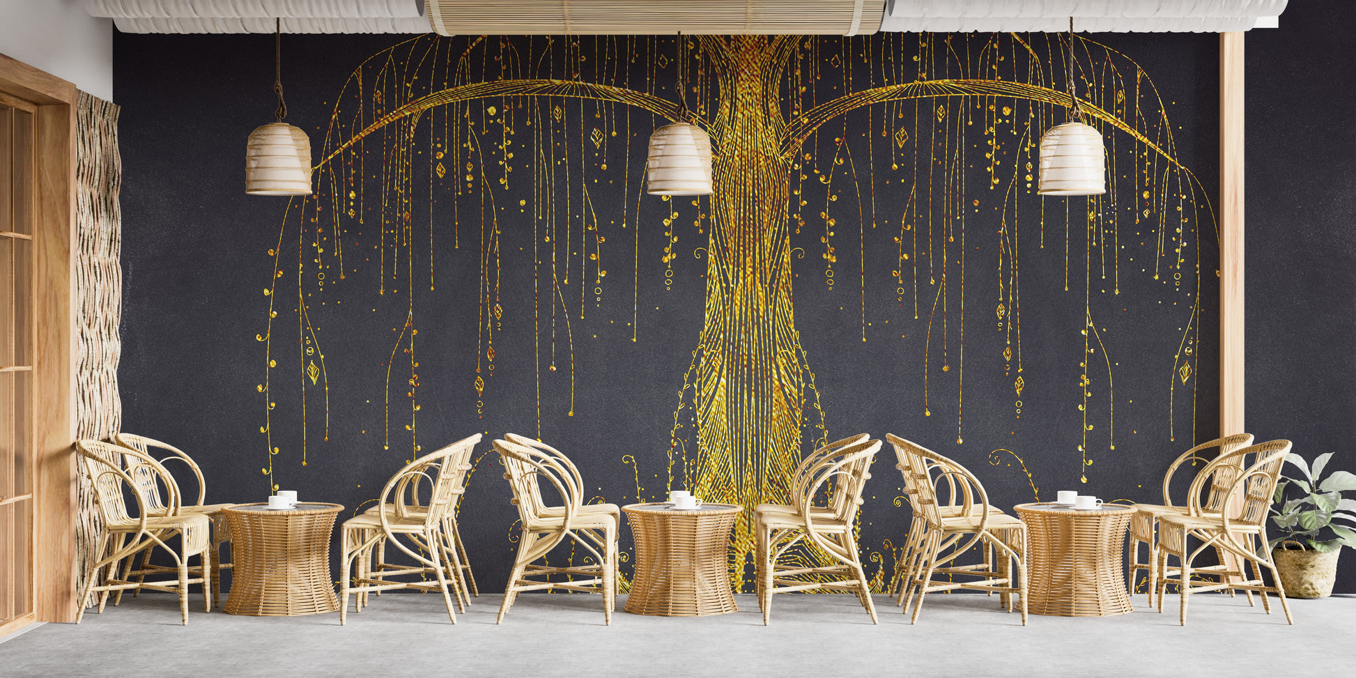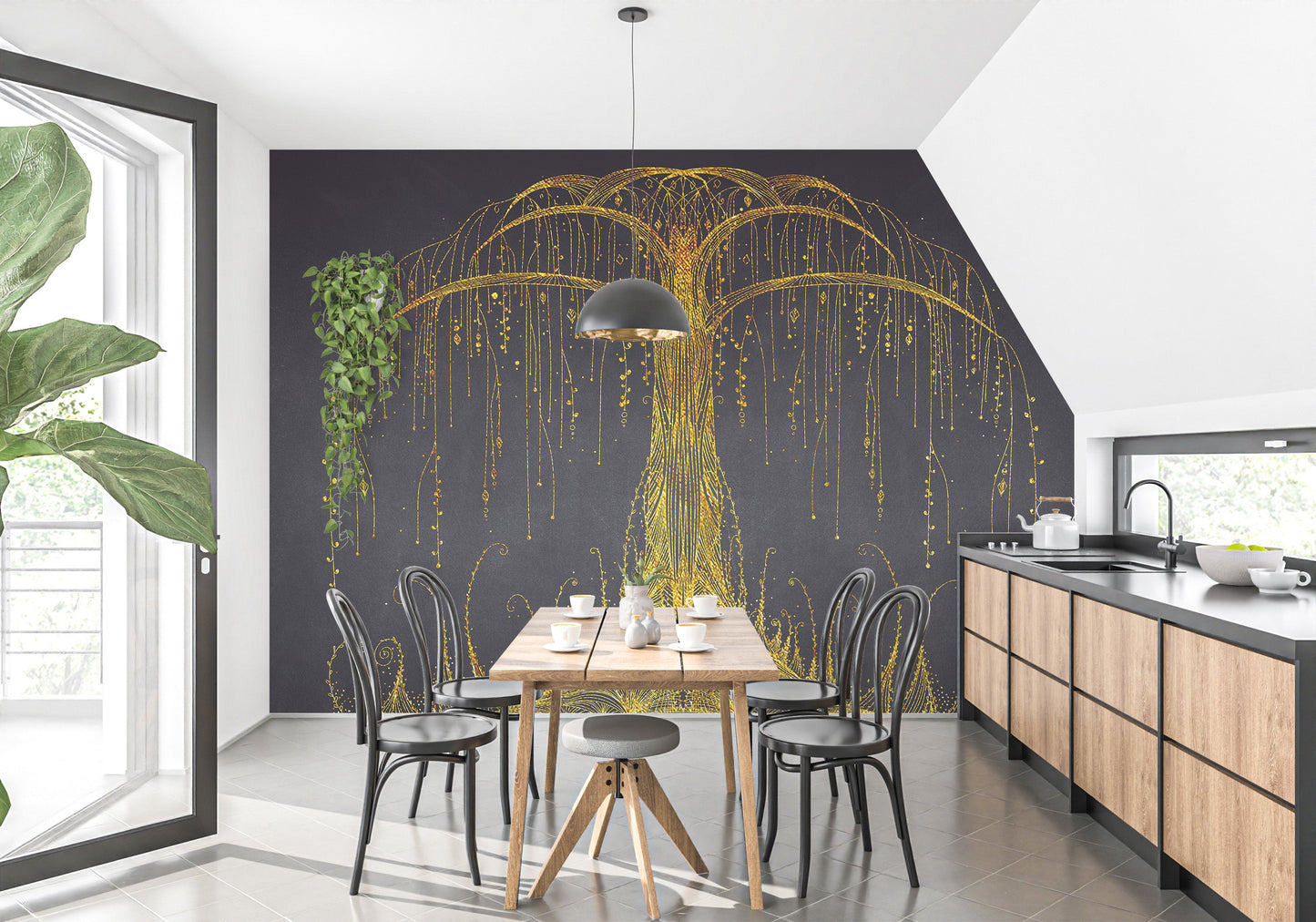 Watching the refined, textural variations of a group of the newest pictorial ornamental architectural tree mural wallpaper scapes, one cannot help but be amazed at the richness of the design and golden tones. Ideal for any room that wants to add a bit of artistic expression, this abstract wallcovering finishes with sophistication and wonder to the walls. The dancing tree boughs and the leaves you see move into life in front of you, giving you a sense of natural beauty and inviting contemplation. So, if you want to revamp your living space and add a golden charm, this abstract wallpaper is the perfect option.