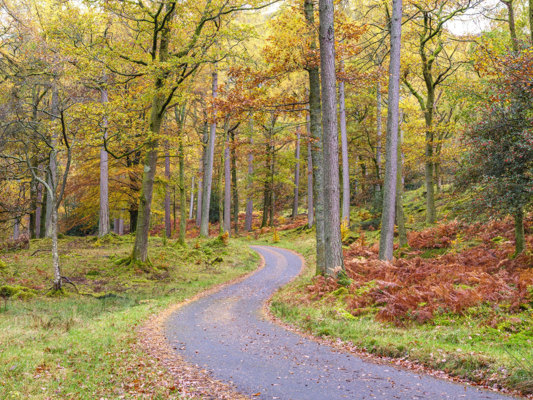 Imagine yourself driving down this picturesque road, surrounded by the breathtaking colors of autumn. This wallpaper transports you to a tranquil forest where golden sunlight filters through vibrant foliage. The winding path, bordered by towering trees dressed in shades of yellow, orange, and red, invites you on a journey through nature's autumnal wonderland. The rich textures and warm tones create a sense of peace and serenity, making this wallpaper perfect for those seeking a calming and inspiring atmosphere in their living space. The image is rich in detail, ensuring a captivating visual experience.