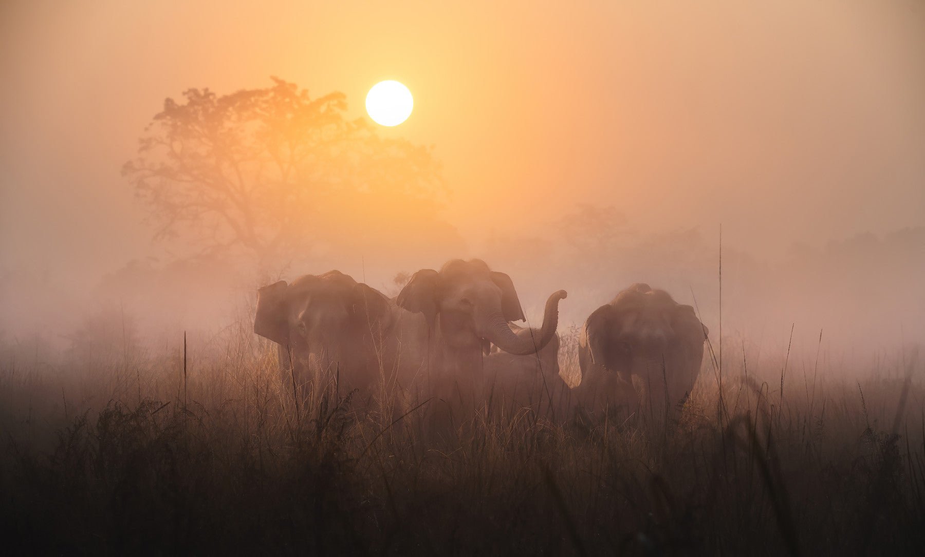 A beautiful golden dawn wallpaper mural featuring majestic elephants silhouetted against a sunrise.