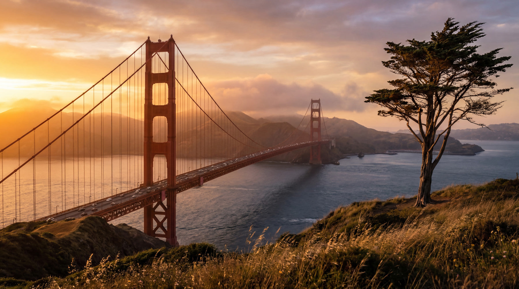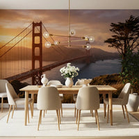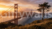 Immerse your space in the iconic grandeur of San Francisco with this captivating **wallpaper for walls**. The majestic Golden Gate Bridge spans the vibrant blue bay, bathed in the warm glow of a setting sun. Golden and amber hues illuminate the expansive sky, casting a dramatic light over the distant hills. The bridge's distinctive reddish-orange stands out against the soft, diffused backdrop, while a solitary cypress tree anchors the foreground with a natural, serene presence. This panoramic design introduces an expansive vista indoors, creating an impactful feature wall. It elevates living rooms, dining areas, or a sophisticated home office, adding both vibrant color and a compelling sense of place to your interior.