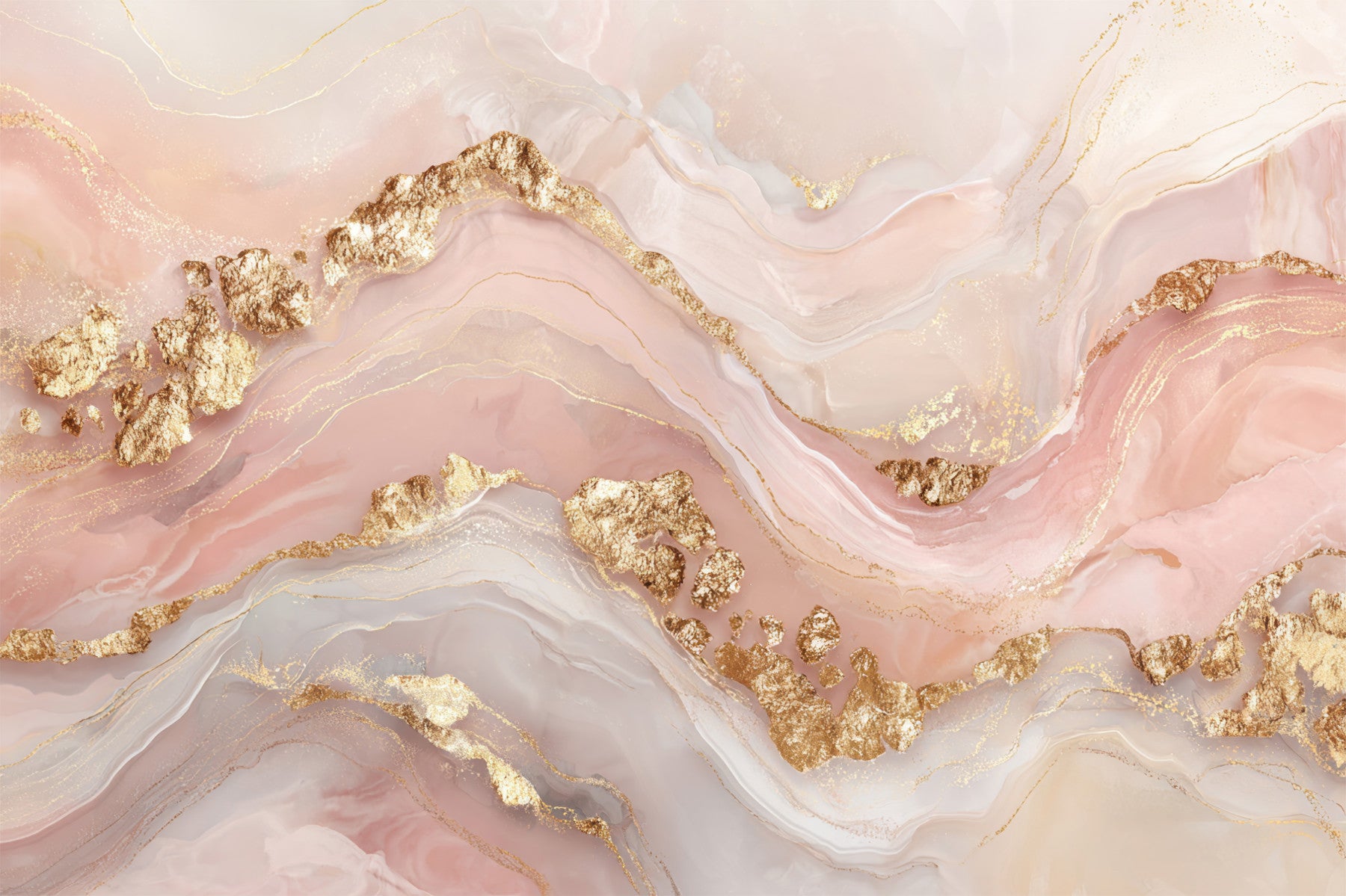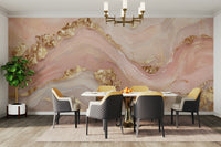 Enhance your interior with this elegant, flowing design. The wallpaper features subtle blush pinks intertwined with gold detailing to make a statement. The delicate gradients and refined details add depth and dimension to any room. Perfect as wallpaper for walls, this design creates a sense of elegance in bedrooms, living rooms, or offices. The blend of soft tones and metallic accents adds a sophisticated finish that suits both modern and traditional decors.