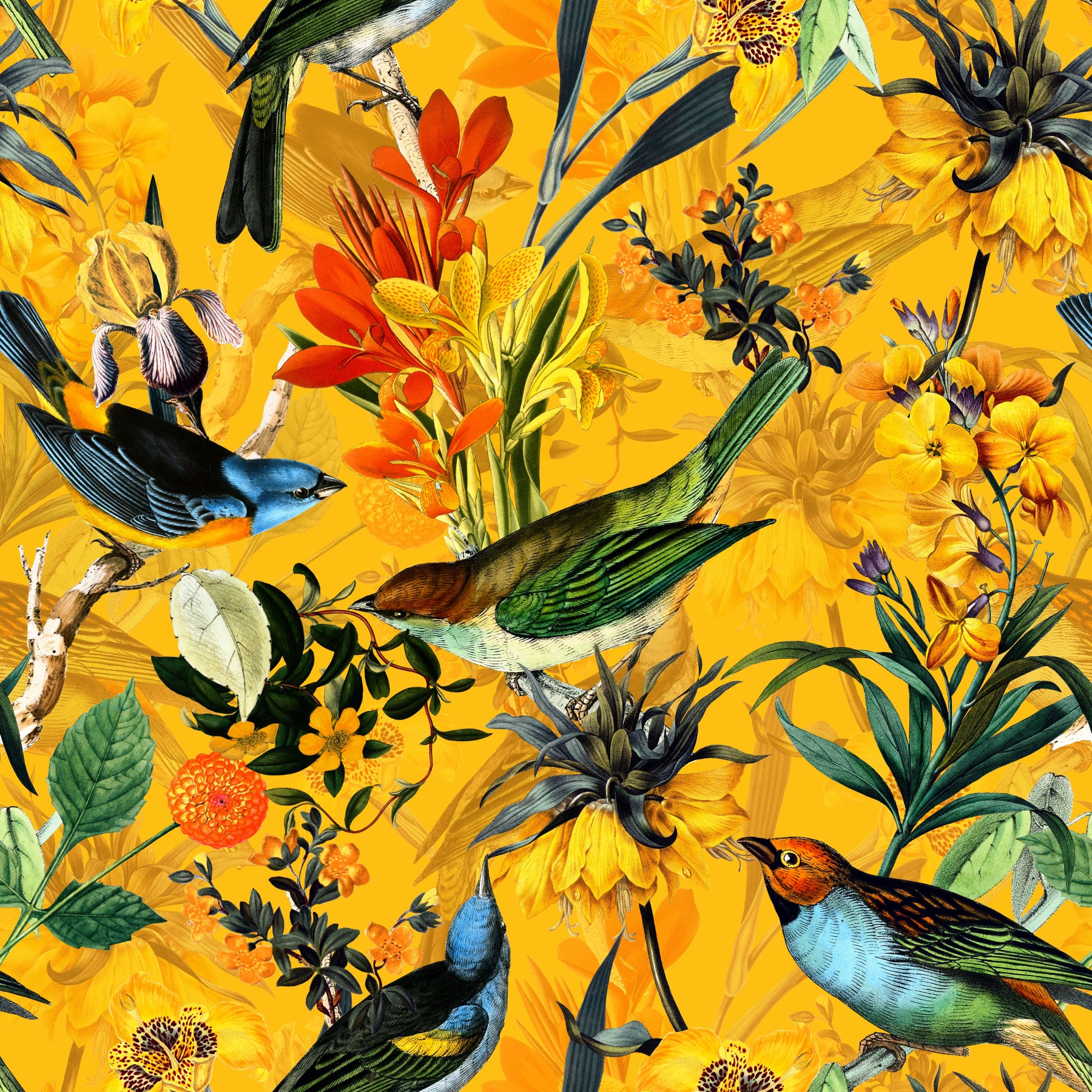 Immerse yourself in the vibrant energy of 'Golden Hour Aviary,' a wallpaper design that bursts with the rich hues of a tropical sunset. Intricate botanical illustrations of exotic flowers, including vibrant cannas and sun-kissed lilies, intertwine with meticulously detailed birds in a dazzling display of nature's artistry. The bold yellow background enhances the intensity of the oranges, reds, and greens, creating a visually captivating and energetic atmosphere. This wallpaper is perfect for adding a touch of whimsical luxury and exotic charm to any space, transforming it into a haven of vibrant beauty.