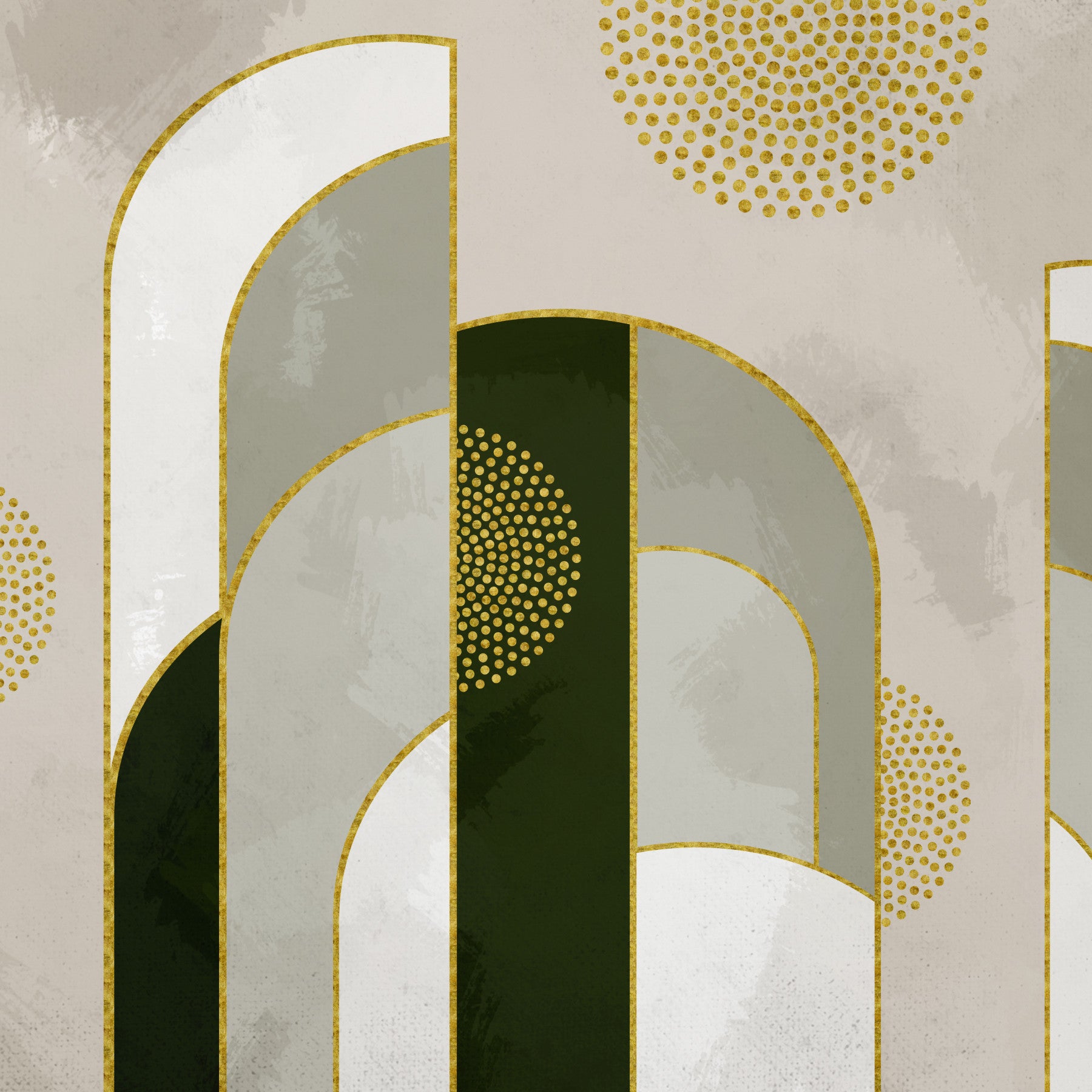 Inspired by the warm glow of sunset, this wallpaper captures the essence of golden hour. The soft, earthy tones of beige and green are accented with shimmering gold details, creating a sophisticated and inviting ambiance. The geometric forms are softened by the subtle textural effect, blending seamlessly into any space. Ideal for creating a calming and luxurious feel in living rooms, bedrooms, or even home offices, this wallpaper adds a touch of warmth and elegance without being overly bold.