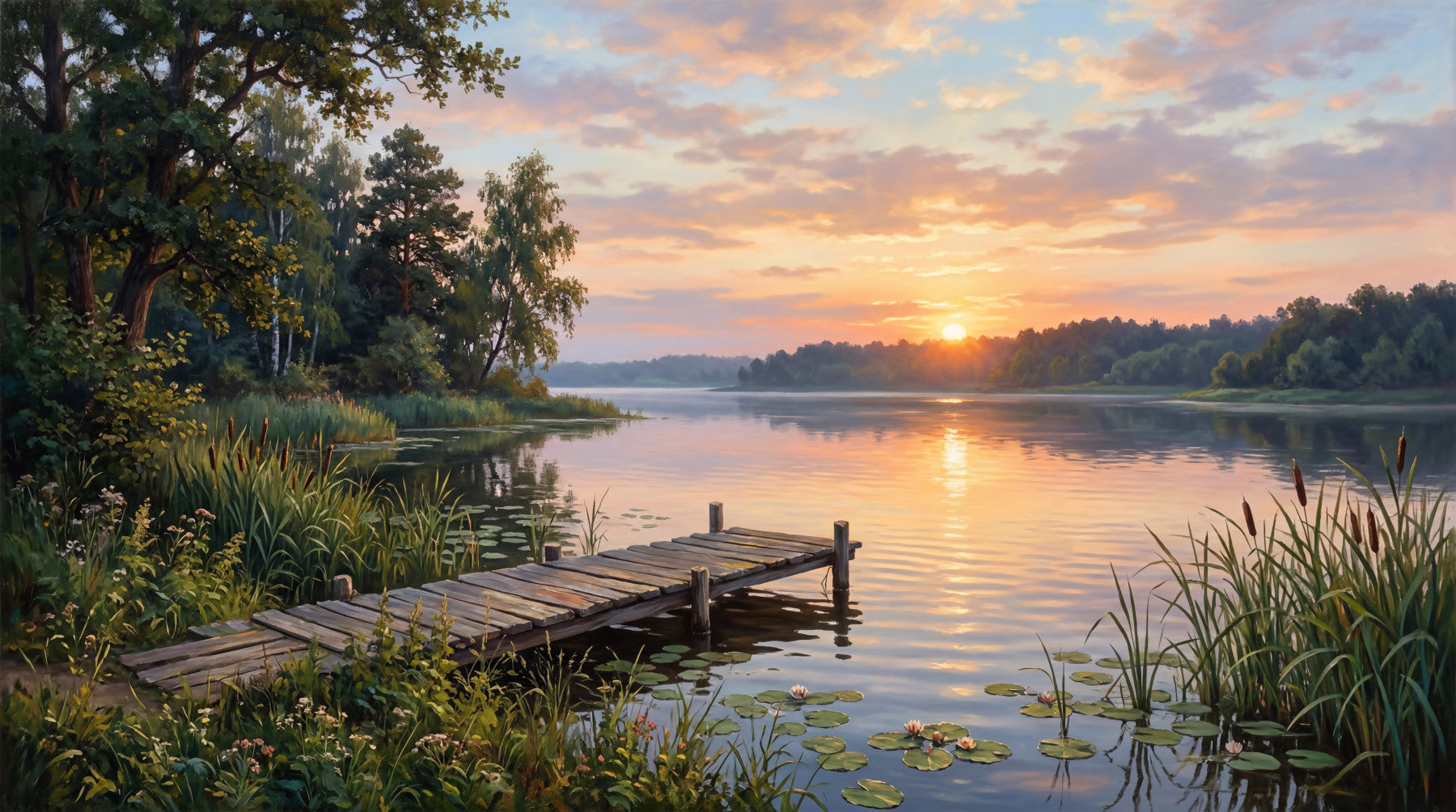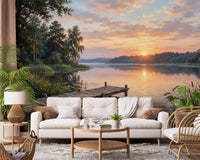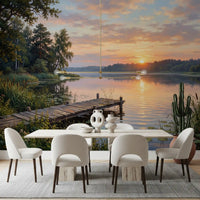Transform your living space with this exquisite nature-inspired wallpaper for walls, capturing a breathtaking golden hour over tranquil waters. The design showcases a rustic wooden pier extending into a serene lake, framed by lush green foliage and delicate water lilies. A soft, vibrant color palette dominates the upper portion, transitioning from gentle purples and blues in the sky to warm oranges and yellows as the sun dips below the horizon, casting shimmering reflections across the water's surface. This painterly landscape brings an atmosphere of peace and relaxation, perfect for enhancing bedrooms, living rooms, or dining areas. It complements natural wood furniture and soft, earthy tones, creating a harmonious and inviting interior. Embrace the calming beauty of a lakeside retreat.