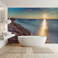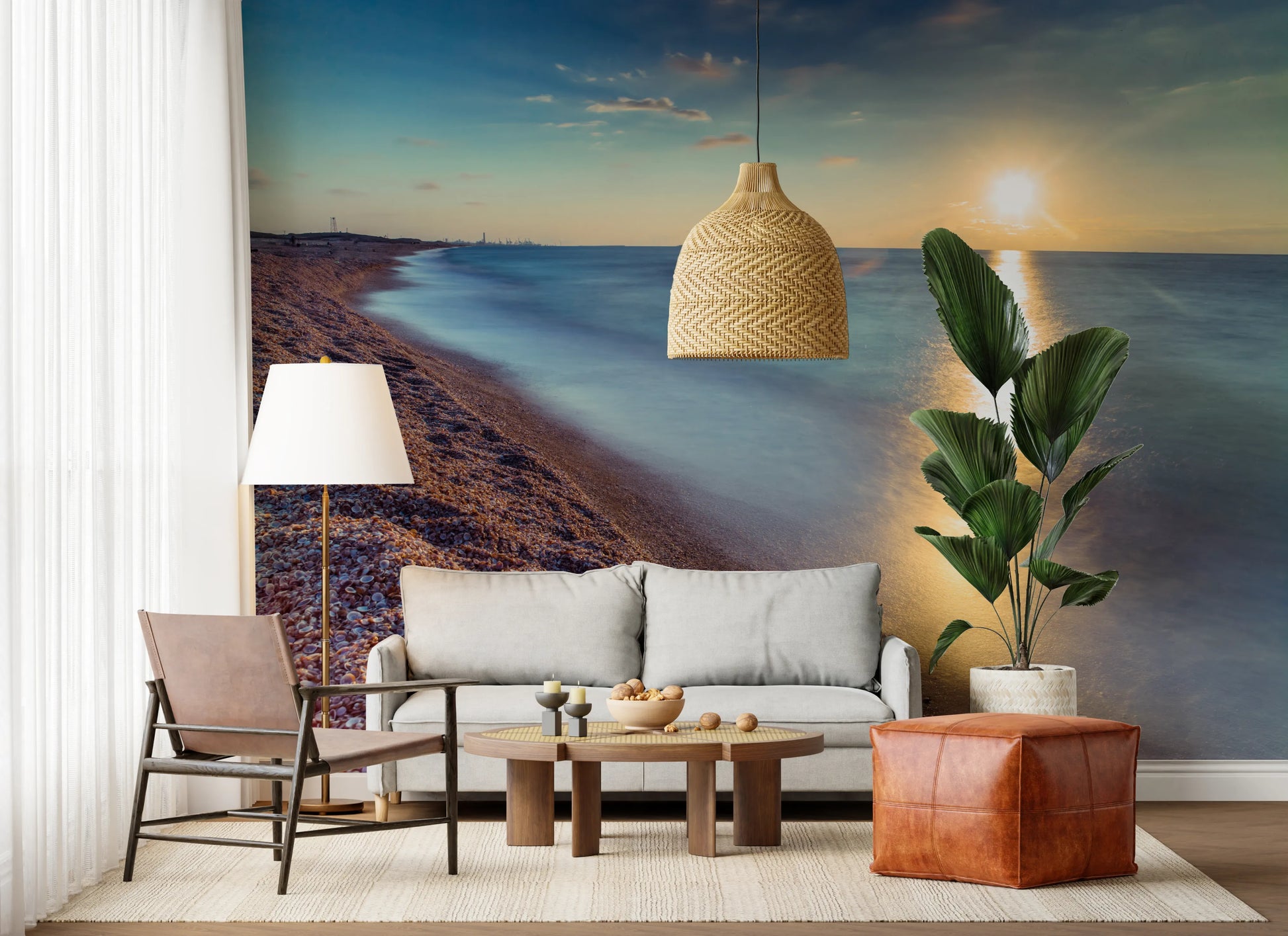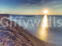 Immerse yourself in the serene beauty of "Golden Hour Shores," a captivating piece of wall art. This image captures the tranquil essence of a coastline bathed in the warm, radiant glow of the setting sun. The gentle ebb and flow of the tide is portrayed with soft, dreamy strokes, creating a sense of peace and calm. A beach adorned with shells transitions from a warm palette of browns and tans in the foreground, leading the eye towards the shimmering expanse of water. The sun's reflection dances on the surface, casting a golden path that invites contemplation and introspection. Introduce a touch of coastal elegance and bask in the everlasting beauty of a golden hour moment.