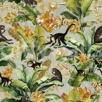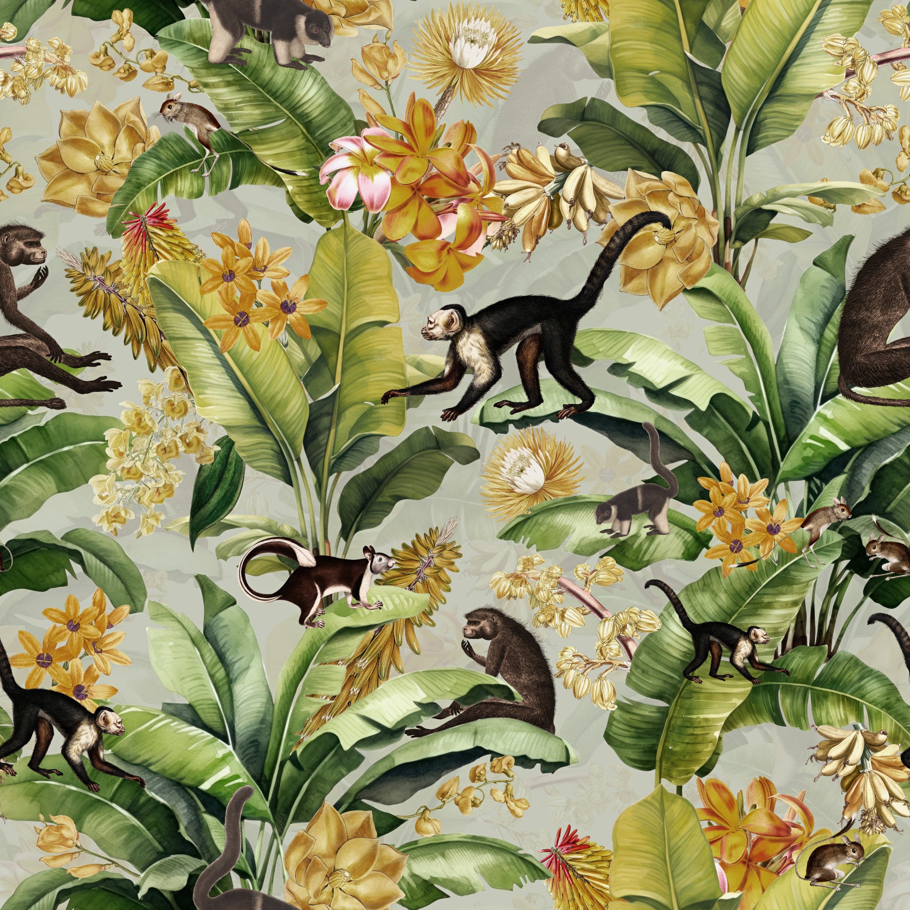 'Golden Jungle Paradise' is a luxurious wallpaper design that transports you to a vibrant tropical haven. Rich golden hues illuminate the exotic flowers and banana leaves, creating a warm and inviting atmosphere. Playful monkeys and other creatures add a touch of whimsical charm. This seamless pattern is rendered in a meticulous watercolor style, achieving a balance of realistic detail and soft, dreamlike quality. Perfect for creating a statement wall in any room, adding an opulent and peaceful ambiance.