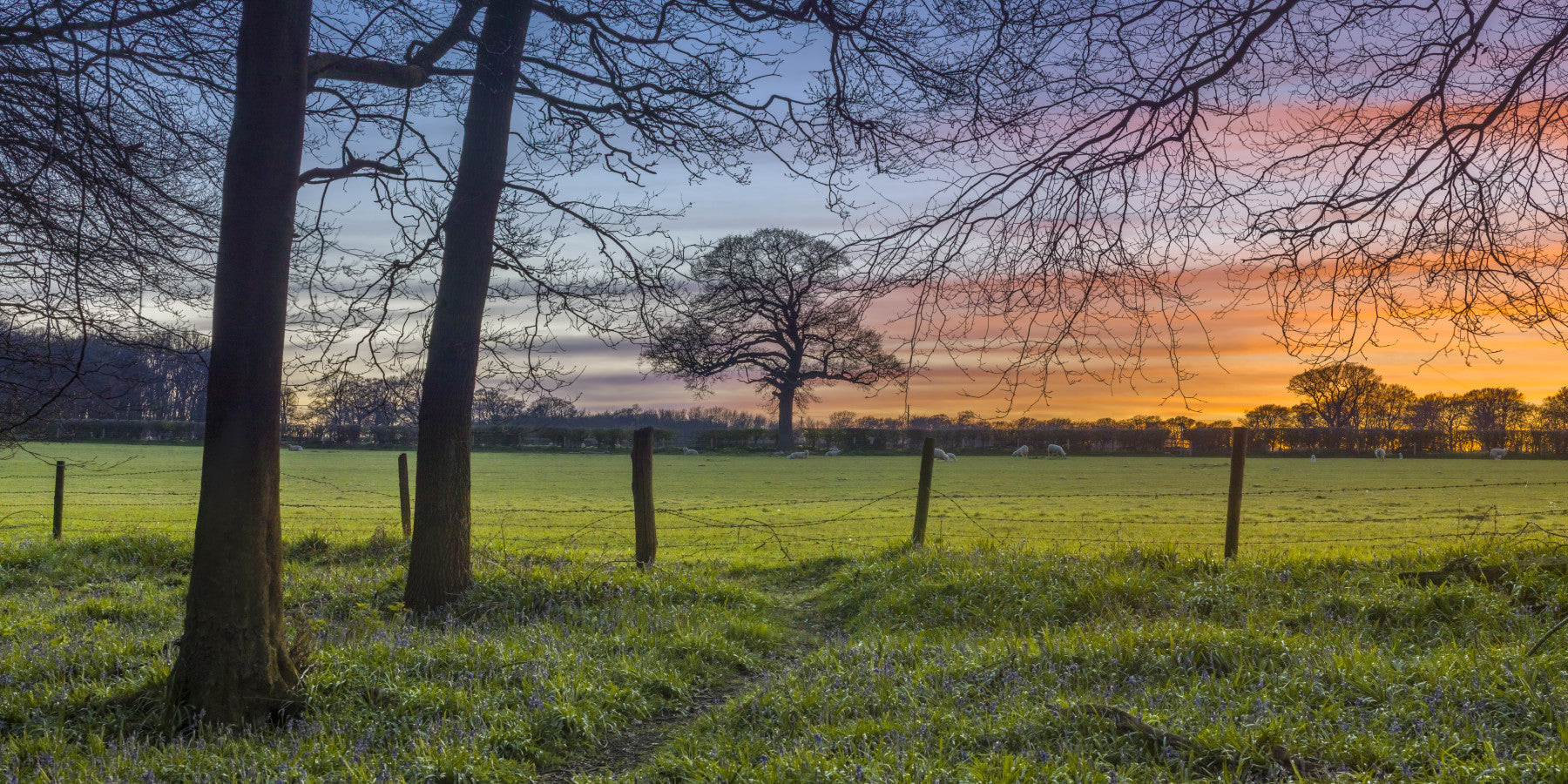 Single tree in grassland. Capture the essence of twilight with this serene wallpaper for walls. Watch as a sun dips beyond the horizon, painting the sky in shades of coral, pink, and azure. This design features graceful trees framing a verdant meadow, offering a blend of natural beauty and tranquil ambiance. The scene's soft hues and open field create a sense of depth and calm, perfectly complementing a living room, bedroom, or hallway, bringing a touch of the outdoors inside.