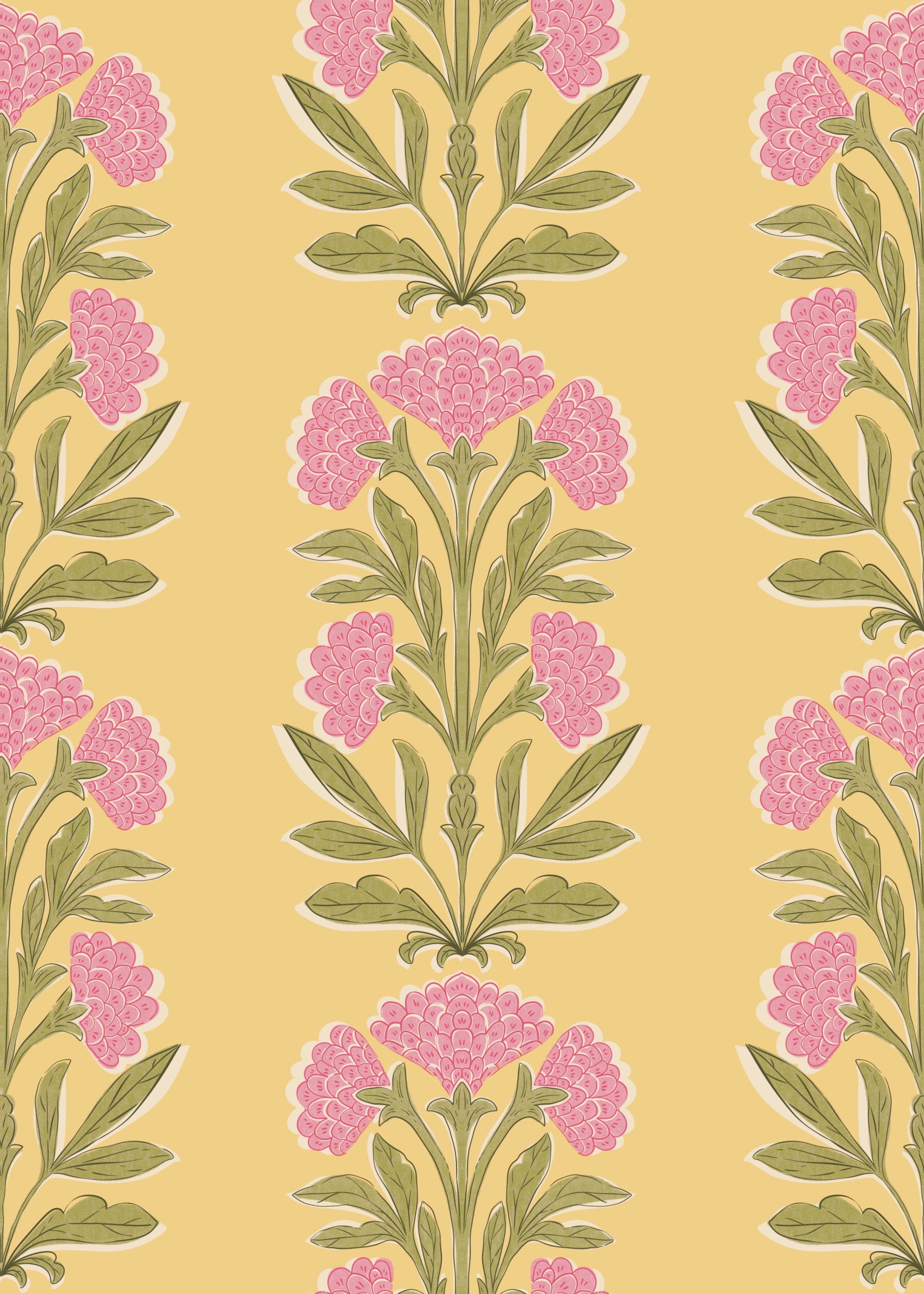 Invite timeless charm into your home with this delightful floral wallpaper. This wallpaper for walls features stylized pink flowers and green leaves arranged in an elegant, symmetrical design against a light yellow backdrop. The pattern evokes a classic Indian textile feel and suits living rooms, bedrooms, or dining areas, creating a soothing and refined space. The blend of muted tones brings a vintage touch, while the vertical arrangement elongates walls, enhancing the room's overall aesthetic.