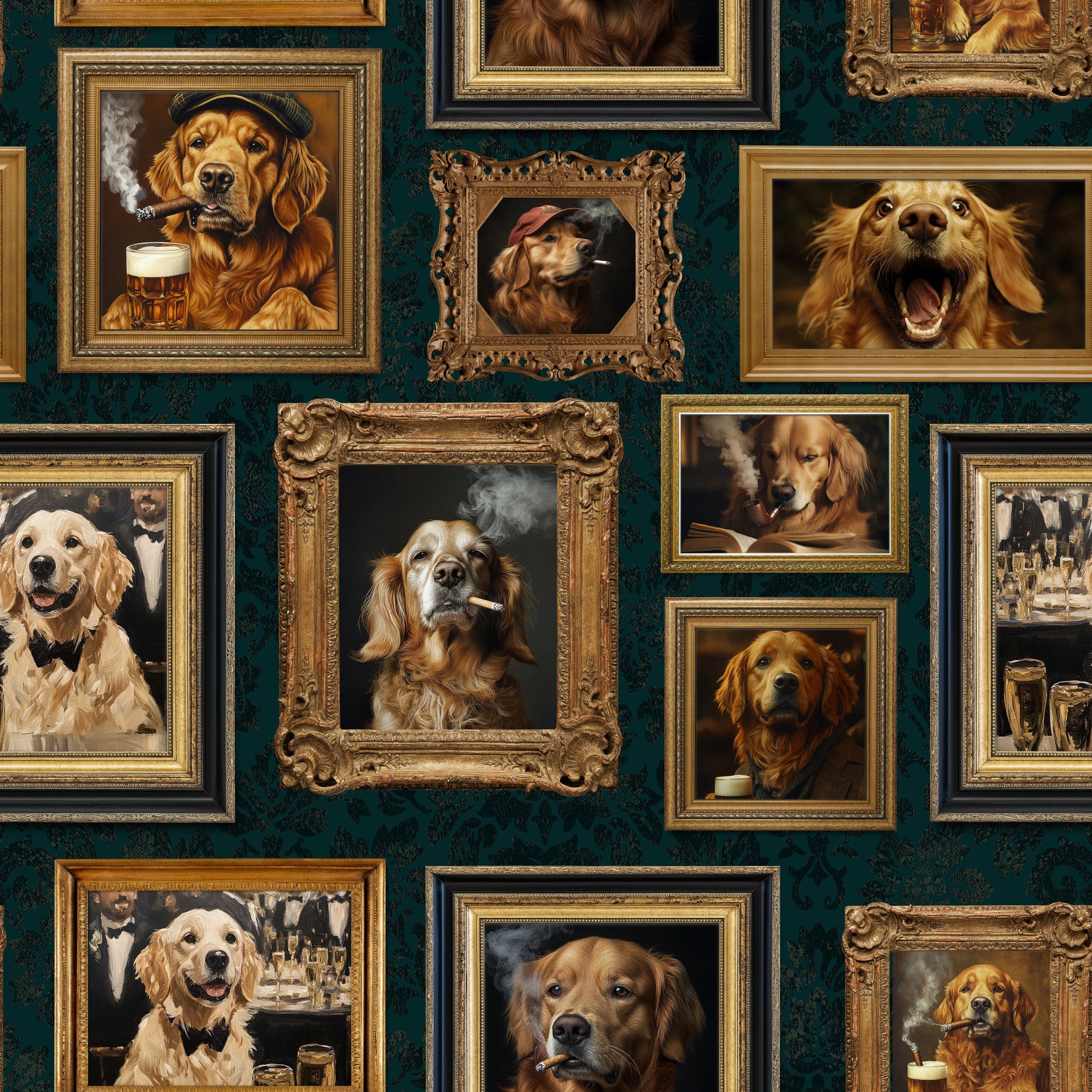 Add a touch of class and playfulness with this golden retriever portrait wallpaper by Uta Naumann. Elegant dogs displayed in a range of poses framed by gold will enhance the style of any room. The rich teal patterned background accentuates the golden tones of the frames and the fur. Picture this wallpaper for walls in a study, living room, or even a sophisticated pet grooming salon. This design brings both elegance and charm creating a cozy yet posh aesthetic. Let these noble hounds bring style and warmth to your interiors.
