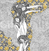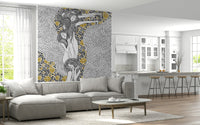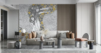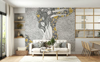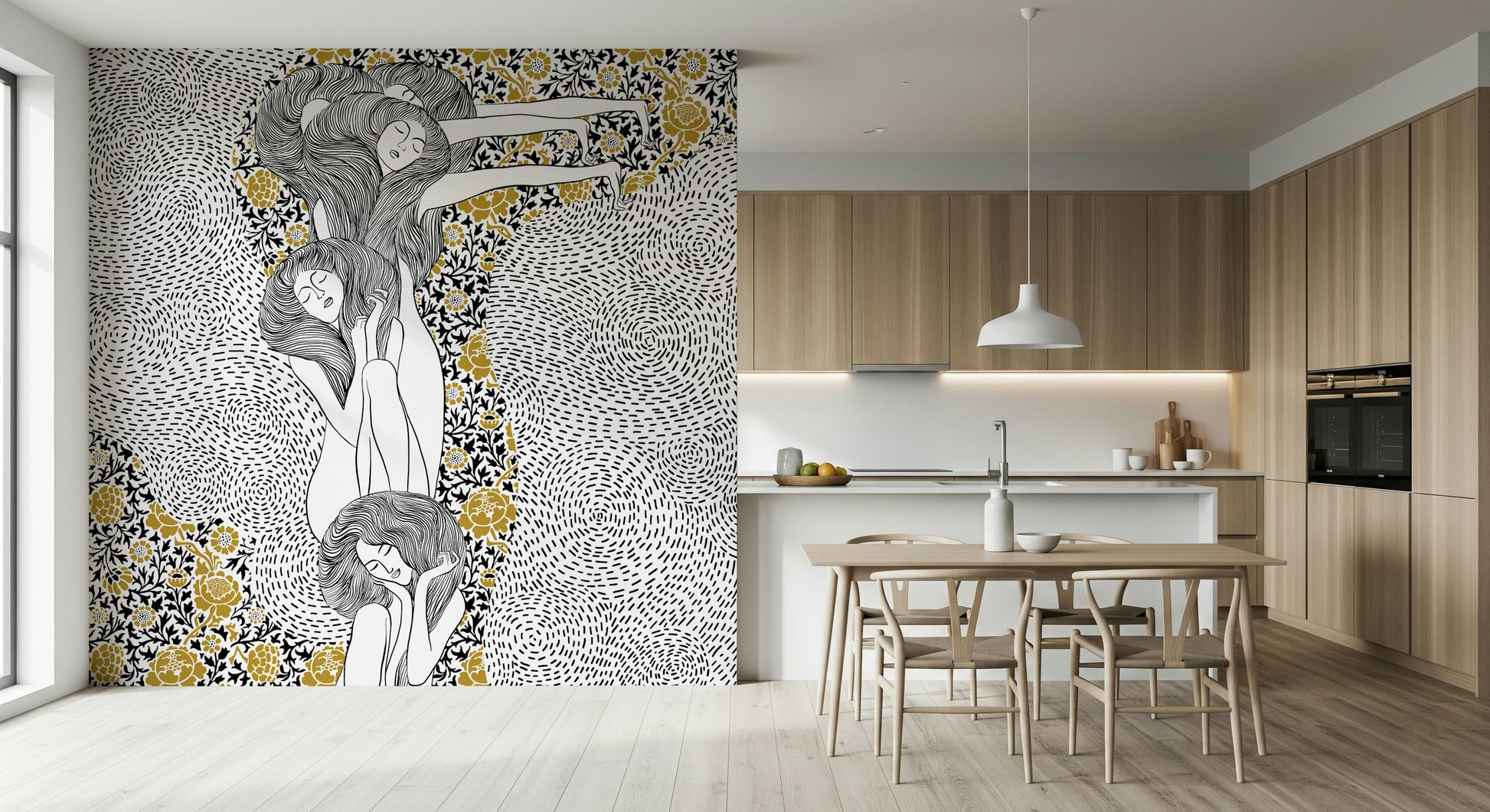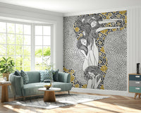 Invite a tranquil yet visually compelling atmosphere into your space with this captivating wallpaper for walls. The design features a vertical arrangement of serene female figures, set against a backdrop of stylized blooms and swirling abstract lines in a black, white, and gold palette. This wallpaper introduces a blend of organic and geometric forms, creating a unique blend of classic and contemporary styles. Enhance the walls of your bedroom, study, or living area with a decorative element that will bring a unique and calming effect. Inspired by Klimt's artwork