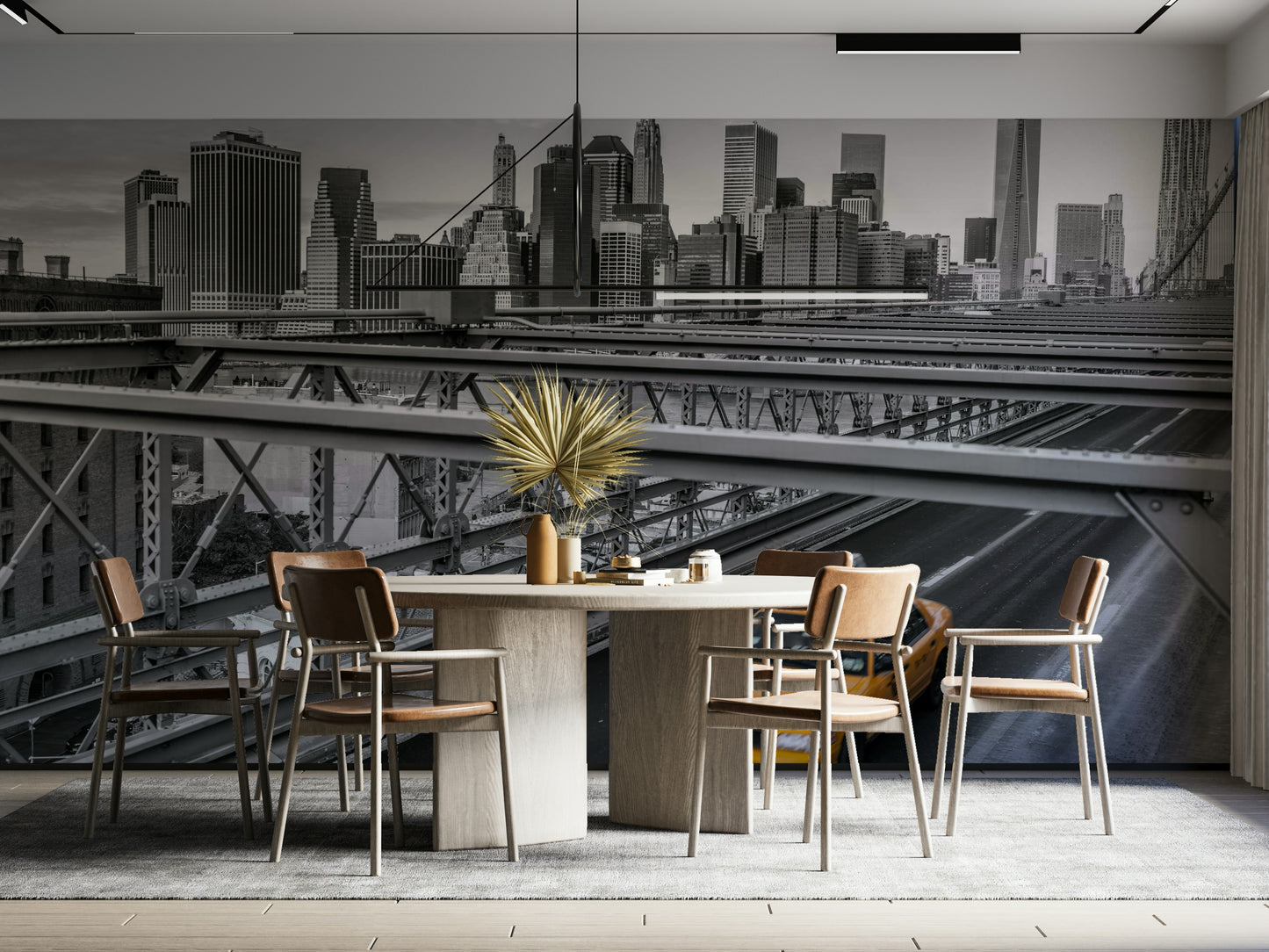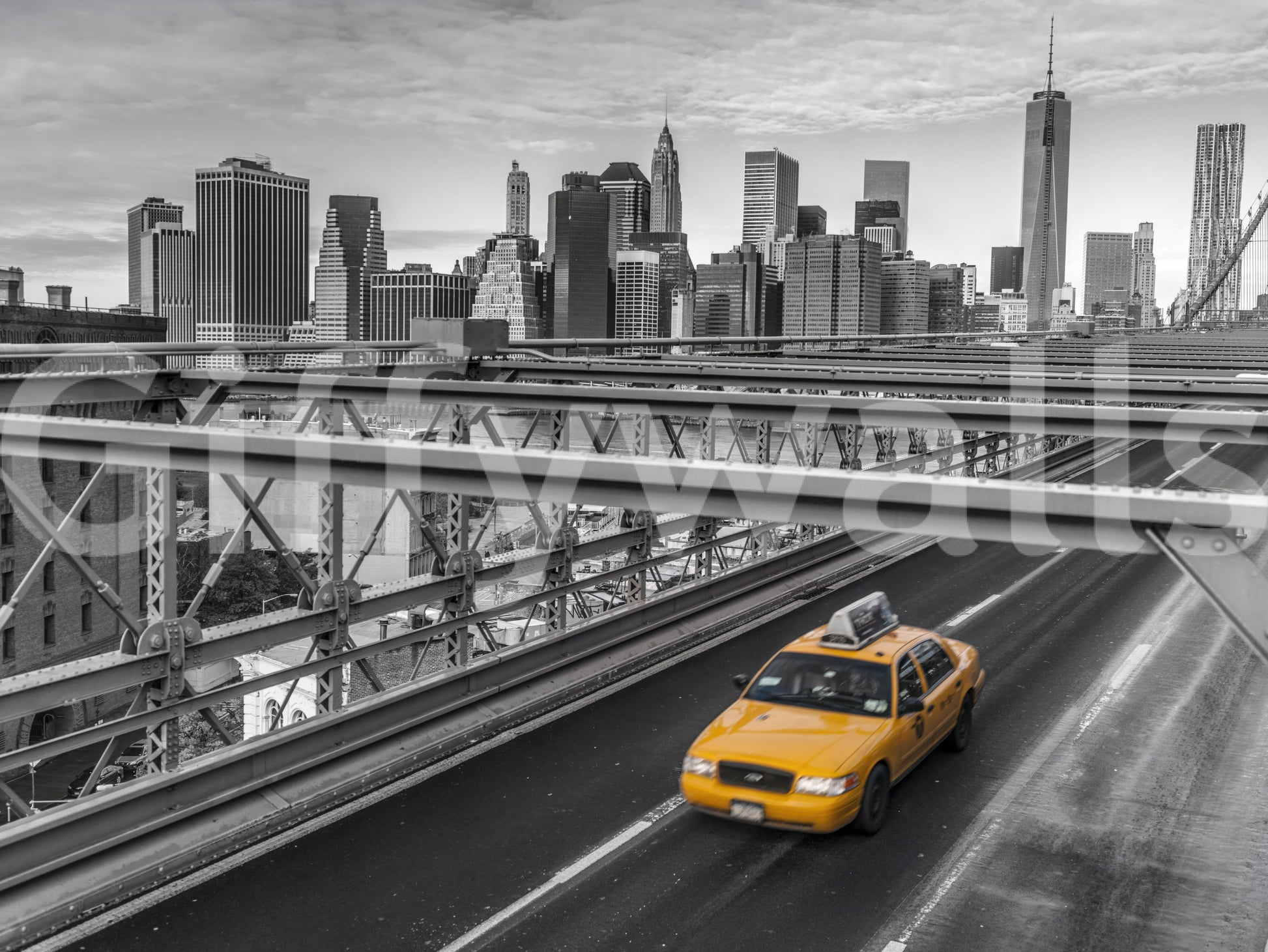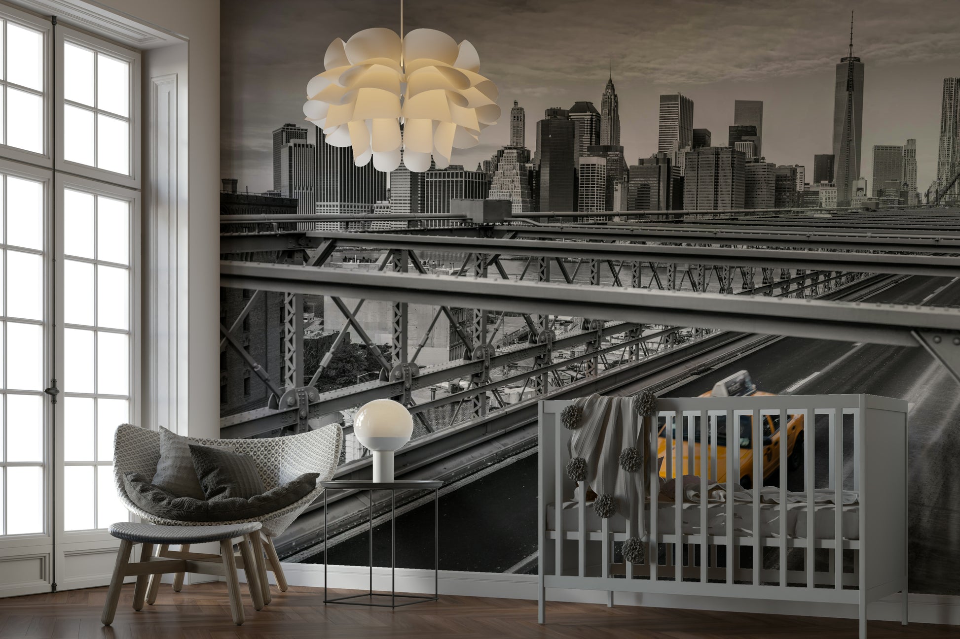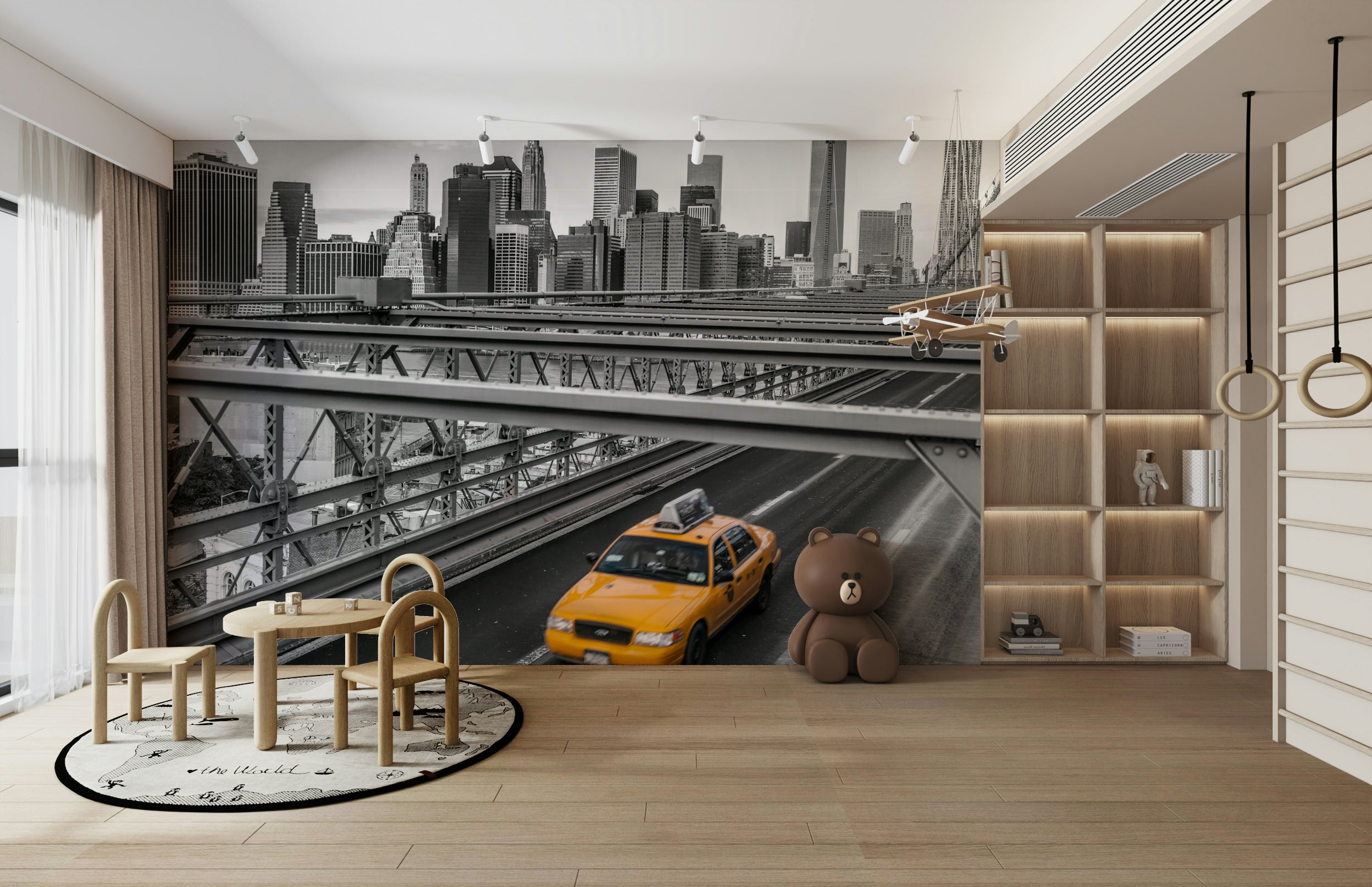 Taxi on Brooklyn Bridge, New York. Witness the timeless allure of New York City with this captivating wallpaper. A vivid yellow taxi races along the Brooklyn Bridge, creating a dynamic focal point against the monochrome backdrop of the iconic skyline. The juxtaposition of the bright, sunlit taxi against the grayscale architecture highlights the city's ability to blend its rich history with contemporary life. This wallpaper is a celebration of New York's enduring energy, perfect for bringing a touch of urban sophistication to any space.