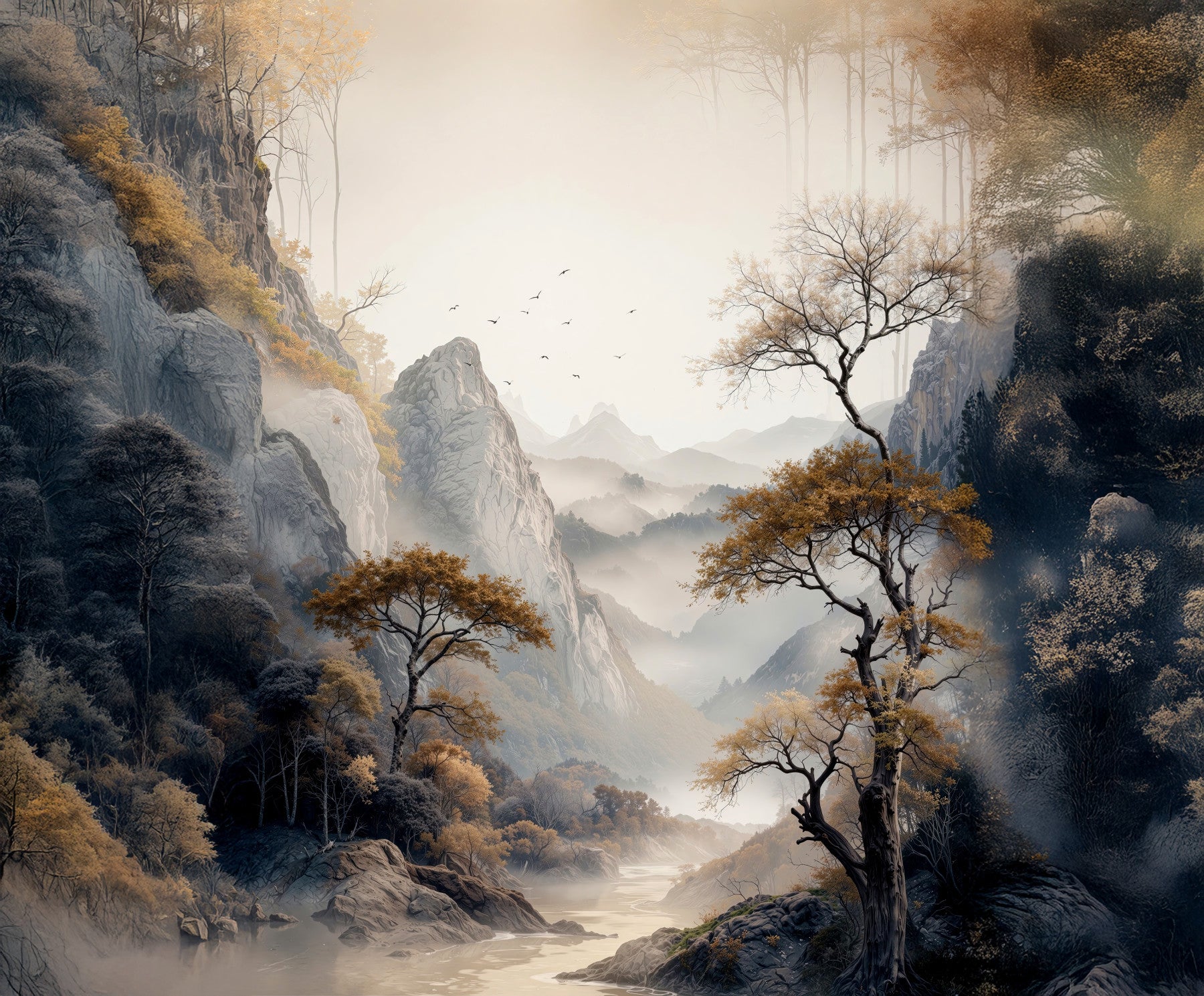 The sophisticated atmosphere created by the serene Golden Tree Serenity Wall Mural.
