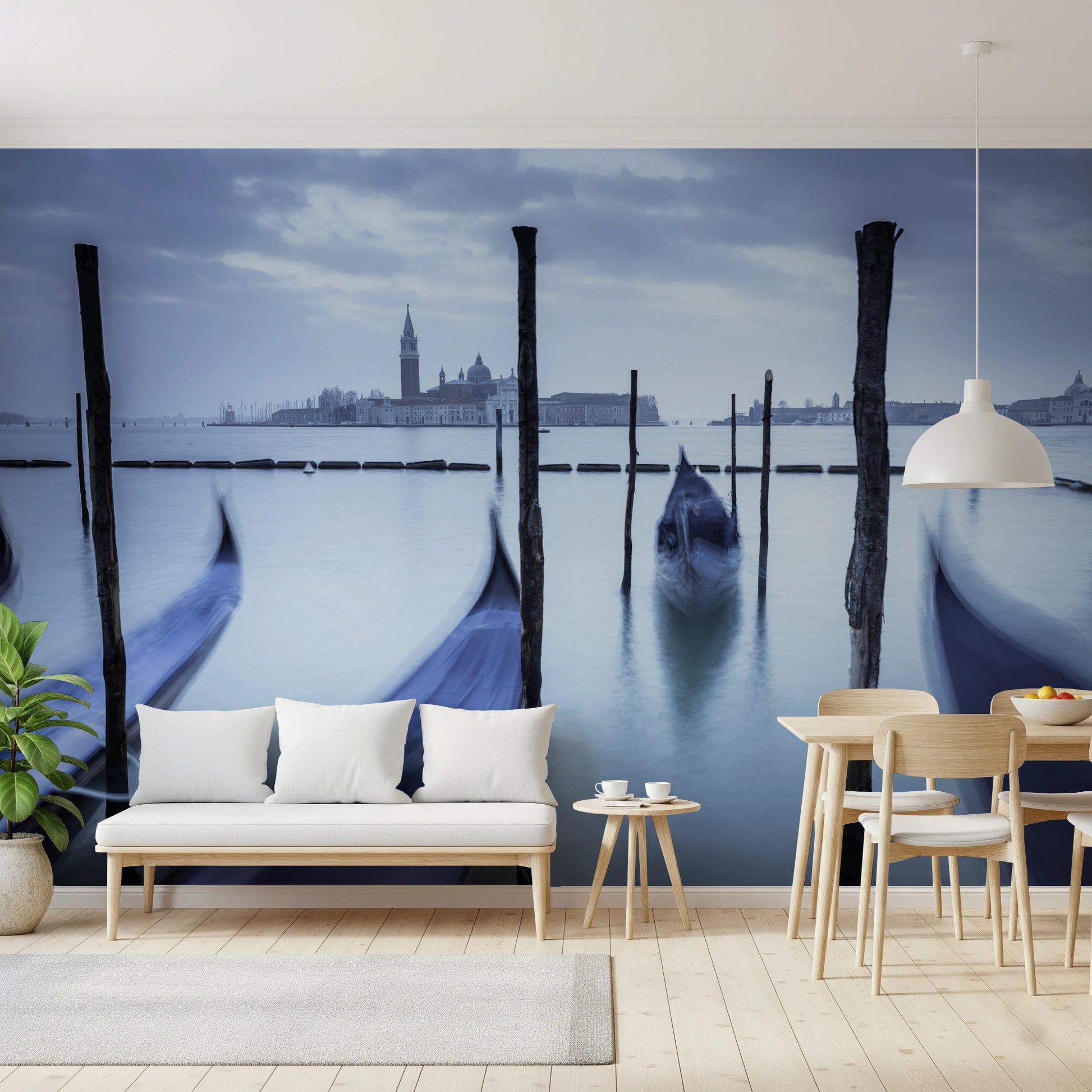 Transform your room into a tranquil canal scene with this Venetian-inspired wallpaper for walls. The dreamy blue and grey tones evoke a sense of calm and serenity, perfect for creating a relaxing atmosphere in your bedroom or living space. Gondola silhouettes glide across the water, adding depth and movement to the design. This wallpaper brings a touch of European elegance to any interior. Its neutral color palette complements a variety of décor styles, from modern minimalist to classic traditional. This wallpaper makes a captivating accent wall in your dining area or a sophisticated backdrop in your home office. Let this enchanting design transport you to the heart of Venice.