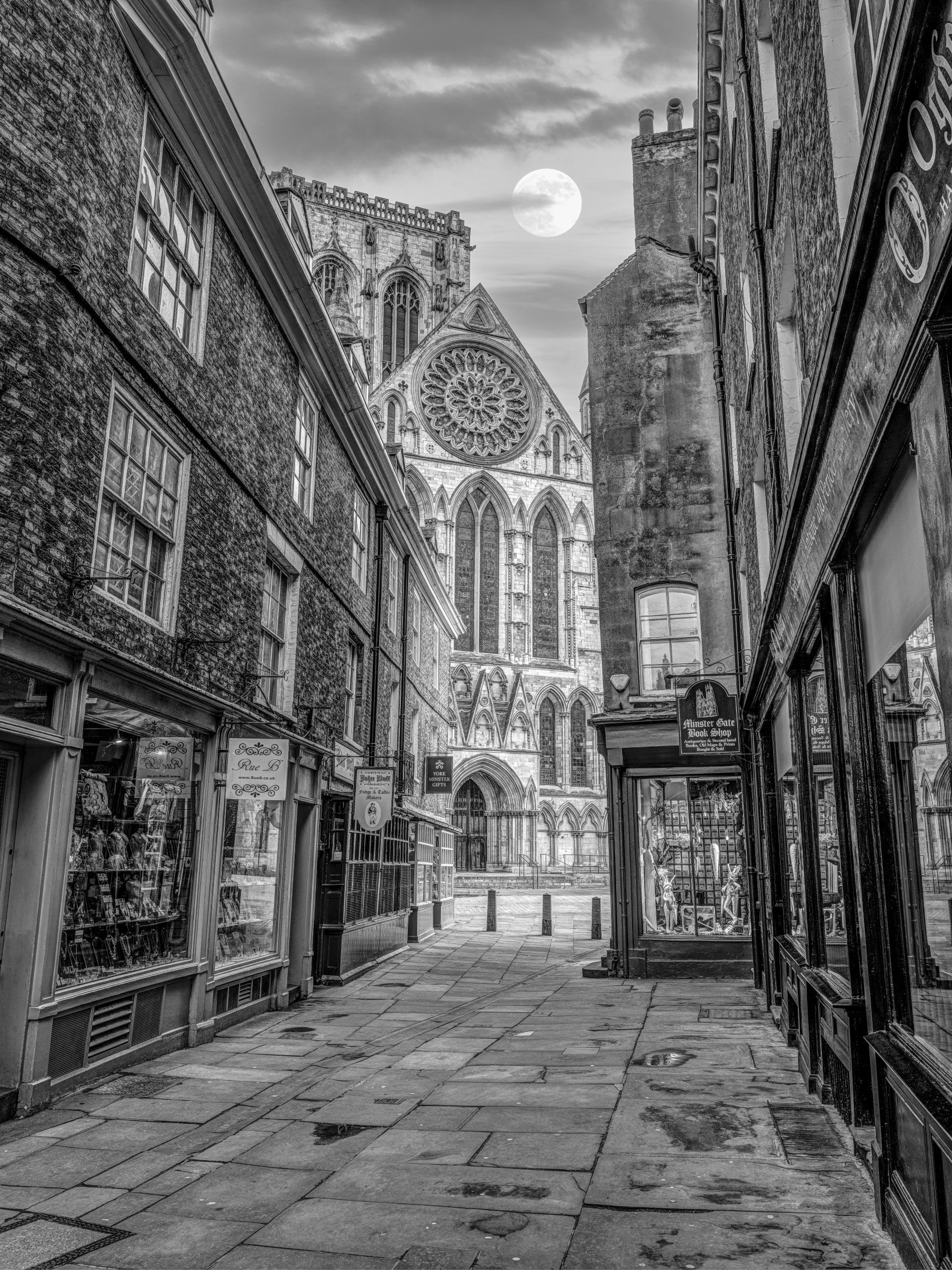 Narrow street through the buildings in York old city. Transform your space with the allure of a historic alleyway. This black and white image showcases an old street with Gothic architecture and a bright moon. The attention to detail and textures give the wallpaper depth, bringing a sense of history to your walls. Consider this wallpaper for walls to create a unique feature in a study, dining room, or bedroom. The stark contrast complements a wide range of decor styles, adding a timeless elegance.