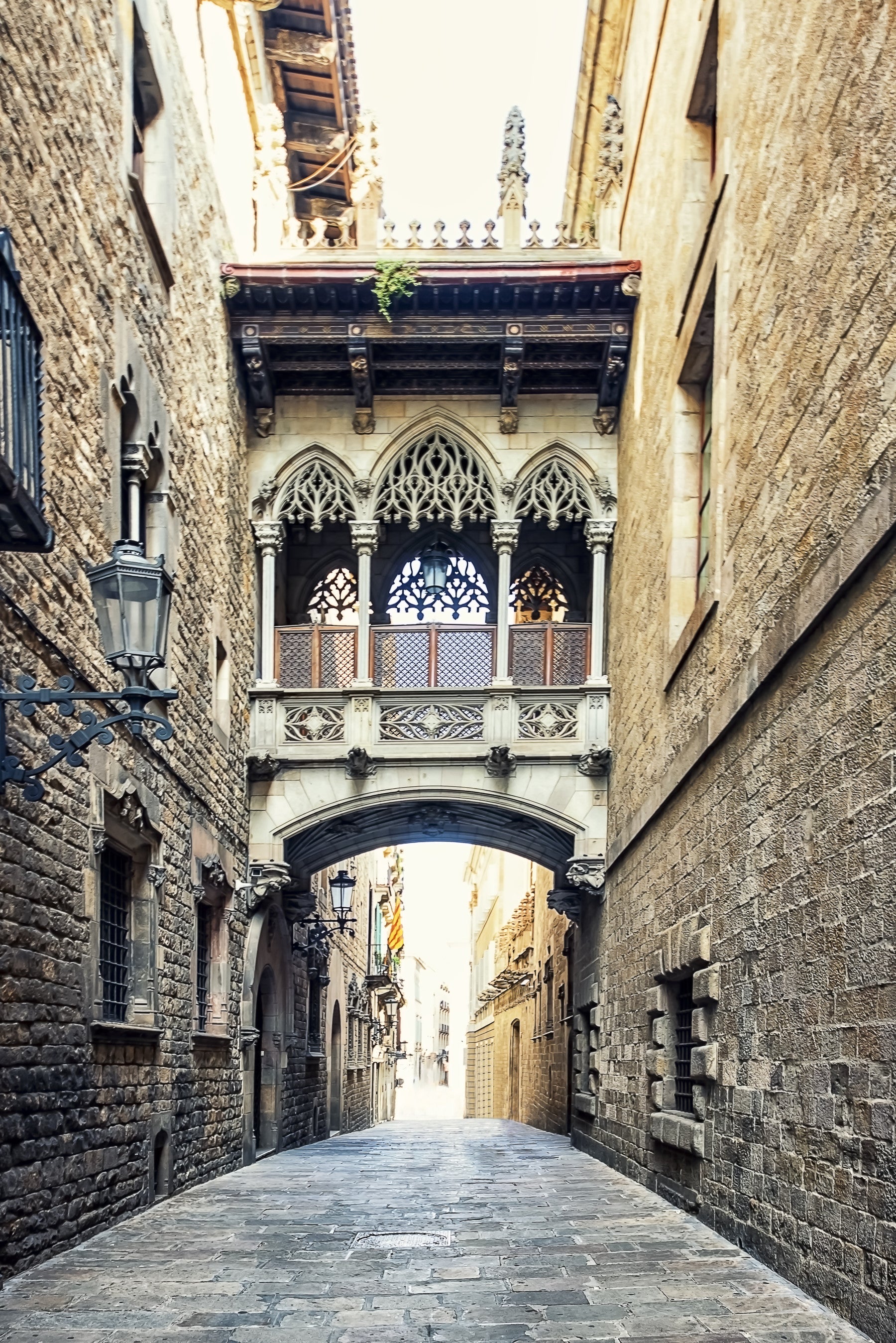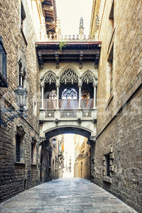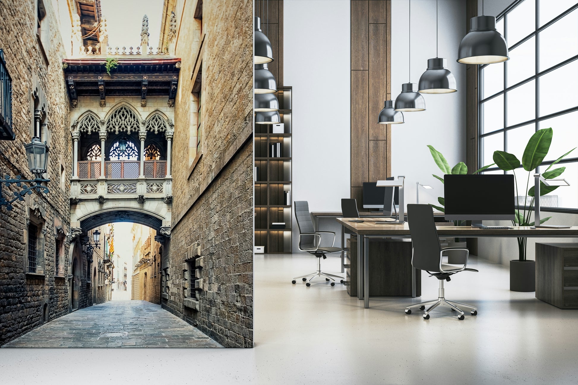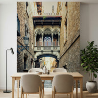 Capture the timeless beauty of a historic European street with this striking wallpaper for walls. This design features an intricate stone archway, common in Barcelona's Gothic Quarter. The warm beige and gray stone evoke a sense of history and old-world charm. It suits areas like living rooms, studies, or hallways, bringing a sophisticated and intriguing atmosphere. This wallpaper works well with a variety of decor styles, from traditional to modern, adding a unique focal point that enhances the room's design.