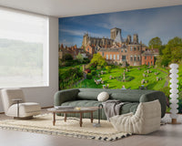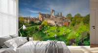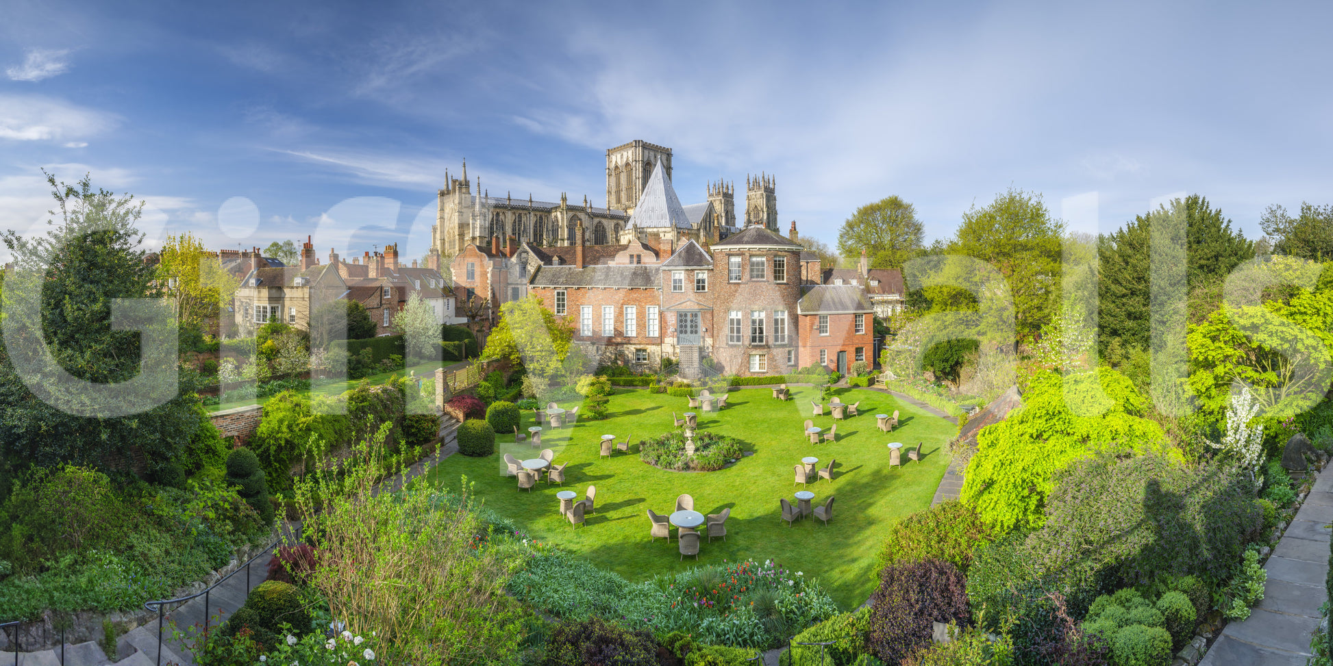 Grays Court Hotel, Yorkshire. Escape to a realm of timeless elegance with this captivating wall décor, inspired by the historic Grays Court Hotel. Imagine transforming your space with a scene of serene tranquility: a meticulously manicured garden unfolds beneath a clear sky, dotted with inviting tables and chairs, perfect for imaginary afternoon teas. The stately architecture of the hotel and the grandeur of the distant cathedral create a breathtaking backdrop. Lush greenery explodes with life, offering a soothing palette of vibrant greens and delicate floral accents. This image evokes a sense of peace, sophistication, and the gentle rhythm of a life well-lived. Infuse your walls with a touch of history and luxurious charm, bringing the ambiance of a stately English garden directly into your home. This décor invites you to unwind and immerse yourself in the quiet beauty of a bygone era.