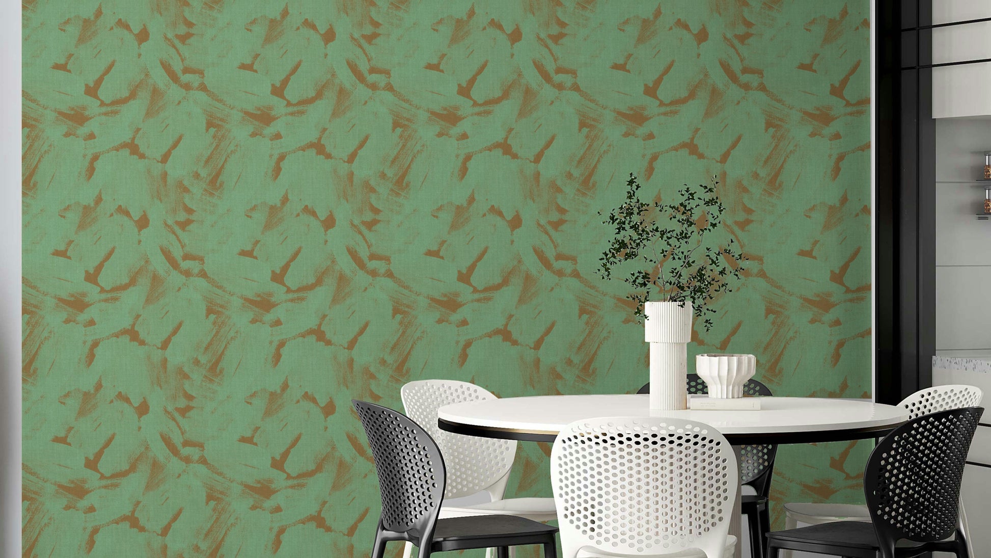 This wallpaper showcases a captivating blend of abstract art and textured design. A soft, calming mint green backdrop provides the perfect canvas for expressive, earthy brown brushstrokes. These strokes are not uniform, creating a dynamic and organic feel, reminiscent of a painter's impulsive gesture. The texture adds depth, suggesting a canvas or linen-like material, lending a tactile quality to the visual experience. The overall mood is serene yet energetic, making it ideal for a space needing a touch of artistic flair without being overly busy. Perfect for modern, minimalist, or nature-inspired aesthetics.